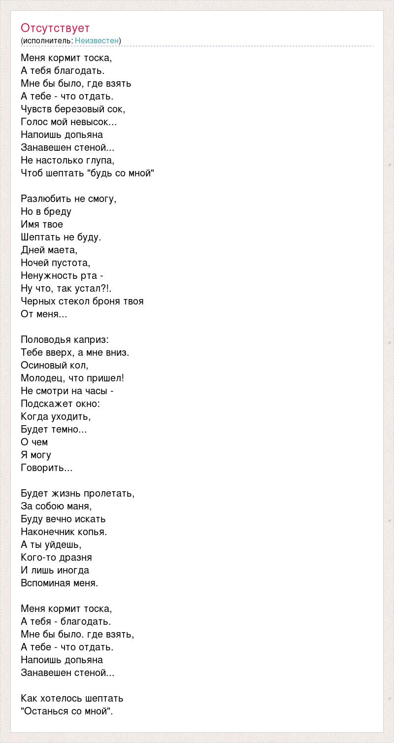 Меня кормит тоска, А тебя благодать. Мне бы было, где взять А тебе - что отдать. Чувств березовый сок, Голос мой невысок... Напоишь допьяна Занавешен стеной... Не настолько глупа, Чтоб шептать "будь со мной" Разлюбить не смогу, Но в бреду Имя твое Шептать не буду. Дней маета, Ночей пустота, Ненужность рта - Ну что, так устал?!. Черных стекол броня твоя От меня... Половодья каприз: Тебе вверх, а мне вниз. Осиновый кол, Молодец, что пришел! Не смотри на часы - Подскажет окно: Когда уходить, Будет темно... О чем Я могу Говорить... Будет жизнь пролетать, За собою маня, Буду вечно искать Наконечник копья. А ты уйдешь, Кого-то дразня И лишь иногда Вспоминая меня. Меня кормит тоска, А тебя - благодать. Мне бы было. где взять, А тебе - что отдать. Напоишь допьяна Занавешен стеной... Как хотелось шептать "Останься со мной".