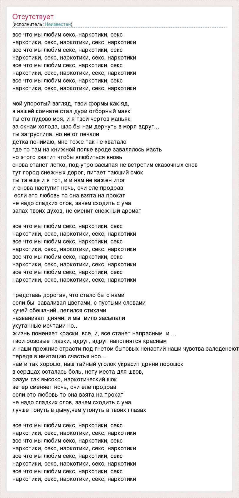 все что мы любим секс, наркотики, секс наркотики, секс, наркотики, секс, наркотики все что мы любим секс, наркотики, секс наркотики, секс, наркотики, секс, наркотики все что мы любим секс, наркотики, секс наркотики, секс, наркотики, секс, наркотики все что мы любим секс, наркотики, секс наркотики, секс, наркотики, секс, наркотики мой упоротый взгляд, твои формы как яд, в нашей комнате стал дури отборный маяк ты сто пудово моя, и я твой чертов маньяк за окнам холода, щас бы нам дернуть в моря вдруг... ты загрустила, но не от печали детка понимаю, мне тоже так не хватало где то там на книжной полке вроде завалялось масть но этого хватит чтобы влюбиться вновь снова станет легко, под утро засыпая не встретим сказочных снов тут город снежных дорог, питает тающий смок ты та еще и я тот, и и нам не важен итог и снова наступит ночь, очи еле продрав если это любовь то она взята на прокат не надо сладких слов, зачем сходить с ума запах твоих духов, не сменит снежный аромат все что мы любим секс, наркотики, секс наркотики, секс, наркотики, секс, наркотики все что мы любим секс, наркотики, секс наркотики, секс, наркотики, секс, наркотики все что мы любим секс, наркотики, секс наркотики, секс, наркотики, секс, наркотики все что мы любим секс, наркотики, секс наркотики, секс, наркотики, секс, наркотики представь дорогая, что стало бы с нами если бы заваливал цветами, с пустыми словами кучей обещаний, делился стихами названивал днями, и мы мило засыпали укутанные мечтами но.. жизнь поменяет краски, все, и, все станет напрасным и ... твои розовые глазки, вдруг, вдруг наполнятся красным и наши прежние страсти под гнетом бытовых ненастий наши чувства заледенеют передя в имитацию счастья ноо… нам и так хорошо, наш тайный уголок украсит дряни порошок в сердцах осталась боль, нету места для швов, разум так высоко, наркотический шок ветер сменяет ночь, очи еле продрав если это любовь то она взята на прокат не надо сладких слов, зачем сходить с ума лучше тонуть в дыму,чем утонуть в твоих глазах все что мы любим секс, наркотики, секс наркотики, секс, наркотики, секс, наркотики все что мы любим секс, наркотики, секс наркотики, секс, наркотики, секс, наркотики все что мы любим секс, наркотики, секс наркотики, секс, наркотики, секс, наркотики все что мы любим секс, наркотики, секс наркотики, секс, наркотики, секс, наркотики