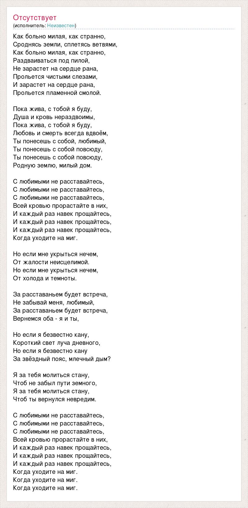 Как больно милая, как странно, Сроднясь земли, сплетясь ветвями, Как больно милая, как странно, Раздваиваться под пилой, Не зарастет на сердце рана, Прольется чистыми слезами, И зарастет на сердце рана, Прольется пламенной смолой. Пока жива, с тобой я буду, Душа и кровь нераздвоимы, Пока жива, с тобой я буду, Любовь и смерть всегда вдвоём, Ты понесешь с собой, любимый, Ты понесешь с собой повсюду, Ты понесешь с собой повсюду, Родную землю, милый дом. С любимыми не расставайтесь, С любимыми не расставайтесь, С любимыми не расставайтесь, Всей кровью прорастайте в них, И каждый раз навек прощайтесь, И каждый раз навек прощайтесь, И каждый раз навек прощайтесь, Когда уходите на миг. Но если мне укрыться нечем, От жалости неисцелимой. Но если мне укрыться нечем, От холода и темноты. За расставаньем будет встреча, Не забывай меня, любимый, За расставаньем будет встреча, Вернемся оба - я и ты, Но если я безвестно кану, Короткий свет луча дневного, Но если я безвестно кану За звёздный пояс, млечный дым? Я за тебя молиться стану, Чтоб не забыл пути земного, Я за тебя молиться стану, Чтоб ты вернулся невредим. С любимыми не расставайтесь, С любимыми не расставайтесь, С любимыми не расставайтесь, Всей кровью прорастайте в них, И каждый раз навек прощайтесь, И каждый раз навек прощайтесь, И каждый раз навек прощайтесь, Когда уходите на миг. Когда уходите на миг. Когда уходите на миг.