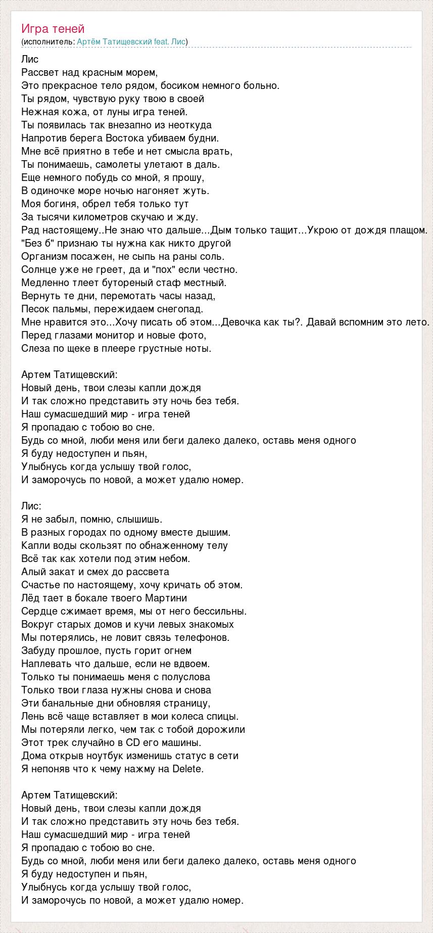 Лис Рассвет над красным морем, Это прекрасное тело рядом, босиком немного больно. Ты рядом, чувствую руку твою в своей Нежная кожа, от луны игра теней. Ты появилась так внезапно из неоткуда Напротив берега Востока убиваем будни. Мне всё приятно в тебе и нет смысла врать, Ты понимаешь, самолеты улетают в даль. Еще немного побудь со мной, я прошу, В одиночке море ночью нагоняет жуть. Моя богиня, обрел тебя только тут За тысячи километров скучаю и жду. Рад настоящему..Не знаю что дальше...Дым только тащит...Укрою от дождя плащом. "Без б" признаю ты нужна как никто другой Организм посажен, не сыпь на раны соль. Солнце уже не греет, да и "пох" если честно. Медленно тлеет бутореный стаф местный. Вернуть те дни, перемотать часы назад, Песок пальмы, пережидаем снегопад. Мне нравится это...Хочу писать об этом...Девочка как ты?. Давай вспомним это лето. Перед глазами монитор и новые фото, Слеза по щеке в плеере грустные ноты. Артем Татищевский: Новый день, твои слезы капли дождя И так сложно представить эту ночь без тебя. Наш сумасшедший мир - игра теней Я пропадаю с тобою во сне. Будь со мной, люби меня или беги далеко далеко, оставь меня одного Я буду недоступен и пьян, Улыбнусь когда услышу твой голос, И заморочусь по новой, а может удалю номер. Лис: Я не забыл, помню, слышишь. В разных городах по одному вместе дышим. Капли воды скользят по обнаженному телу Всё так как хотели под этим небом. Алый закат и смех до рассвета Счастье по настоящему, хочу кричать об этом. Лёд тает в бокале твоего Мартини Сердце сжимает время, мы от него бессильны. Вокруг старых домов и кучи левых знакомых Мы потерялись, не ловит связь телефонов. Забуду прошлое, пусть горит огнем Наплевать что дальше, если не вдвоем. Только ты понимаешь меня с полуслова Только твои глаза нужны снова и снова Эти банальные дни обновляя страницу, Лень всё чаще вставляет в мои колеса спицы. Мы потеряли легко, чем так с тобой дорожили Этот трек случайно в CD его машины. Дома открыв ноутбук изменишь статус в сети Я непоняв что к чему нажму на Delete. Артем Татищевский: Новый день, твои слезы капли дождя И так сложно представить эту ночь без тебя. Наш сумасшедший мир - игра теней Я пропадаю с тобою во сне. Будь со мной, люби меня или беги далеко далеко, оставь меня одного Я буду недоступен и пьян, Улыбнусь когда услышу твой голос, И заморочусь по новой, а может удалю номер.