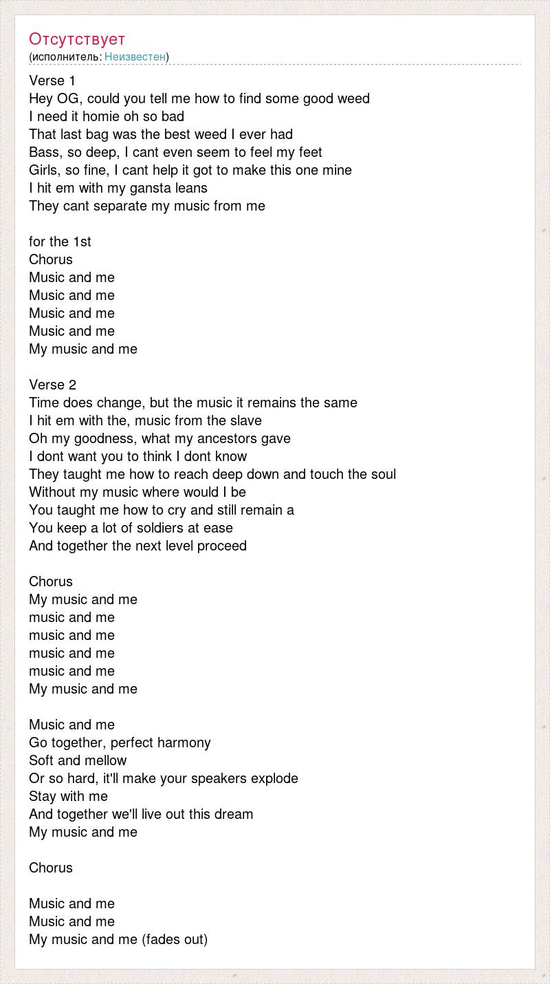 Verse 1 Hey OG, could you tell me how to find some good weed I need it homie oh so bad That last bag was the best weed I ever had Bass, so deep, I cant even seem to feel my feet Girls, so fine, I cant help it got to make this one mine I hit em with my gansta leans They cant separate my music from me for the 1st Chorus Music and me Music and me Music and me Music and me My music and me Verse 2 Time does change, but the music it remains the same I hit em with the, music from the slave Oh my goodness, what my ancestors gave I dont want you to think I dont know They taught me how to reach deep down and touch the soul Without my music where would I be You taught me how to cry and still remain a You keep a lot of soldiers at ease And together the next level proceed Chorus My music and me music and me music and me music and me music and me My music and me Music and me Go together, perfect harmony Soft and mellow Or so hard, it'll make your speakers explode Stay with me And together we'll live out this dream My music and me Chorus Music and me Music and me My music and me (fades out)