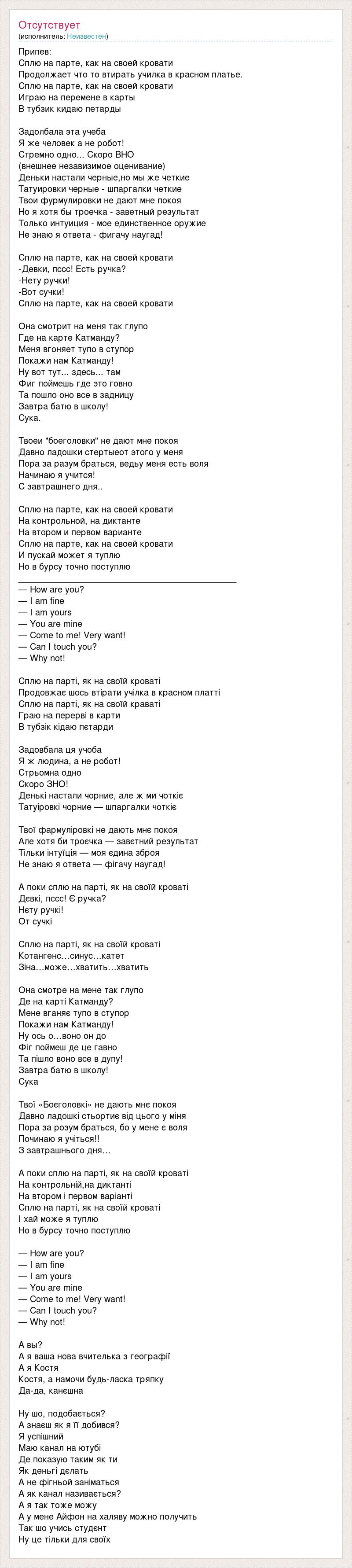 Припев: Сплю на парте, как на своей кровати Продолжает что то втирать училка в красном платье. Сплю на парте, как на своей кровати Играю на перемене в карты В тубзик кидаю петарды Задолбала эта учеба Я же человек а не робот! Стремно одно... Скоро ВНО (внешнее незавизимое оценивание) Деньки настали черные,но мы же четкие Татуировки черные - шпаргалки четкие Твои фурмулировки не дают мне покоя Но я хотя бы троечка - заветный результат Только интуиция - мое единственное оружие Не знаю я ответа - фигачу наугад! Сплю на парте, как на своей кровати -Девки, пссс! Есть ручка? -Нету ручки! -Вот сучки! Сплю на парте, как на своей кровати Она смотрит на меня так глупо Где на карте Катманду? Меня вгоняет тупо в ступор Покажи нам Катманду! Ну вот тут... здесь... там Фиг поймешь где это говно Та пошло оно все в задницу Завтра батю в школу! Сука. Твоеи "боеголовки" не дают мне покоя Давно ладошки стертыеот этого у меня Пора за разум браться, ведьу меня есть воля Начинаю я учится! С завтрашнего дня.. Сплю на парте, как на своей кровати На контрольной, на диктанте На втором и первом варианте Сплю на парте, как на своей кровати И пускай может я туплю Но в бурсу точно поступлю _____________________________________________ — How are you? — I am fine — I am yours — You are mine — Come to me! Very want! — Can I touch you? — Why not! Сплю на парті, як на своїй кроваті Продовжає шось втірати учілка в красном платті Сплю на парті, як на своїй краваті Граю на перерві в карти В тубзік кідаю пєтарди Задовбала ця учоба Я ж людина, а не робот! Стрьомна одно Скоро ЗНО! Денькі настали чорние, але ж ми чоткіє Татуіровкі чорние — шпаргалки чоткіє Твої фармуліровкі не дають мнє покоя Але хотя би троєчка — завєтний результат Тільки інтуїція — моя єдина зброя Не знаю я ответа — фігачу наугад! А поки сплю на парті, як на своїй кроваті Дєвкі, пссс! Є ручка? Нєту ручкі! От сучкі Сплю на парті, як на своїй кроваті Котангенс…синус…катет Зіна…може…хватить…хватить Она смотре на мене так глупо Де на карті Катманду? Мене вганяє тупо в ступор Покажи нам Катманду! Ну ось о…воно он до Фіг поймеш де це гавно Та пішло воно все в дупу! Завтра батю в школу! Сука Твої «Боєголовкі» не дають мнє покоя Давно ладошкі стьортиє від цього у міня Пора за розум браться, бо у мене є воля Починаю я учіться!! З завтрашнього дня… А поки сплю на парті, як на своїй кроваті На контрольній,на диктанті На втором і первом варіанті Сплю на парті, як на своїй кроваті І хай може я туплю Но в бурсу точно поступлю — How are you? — I am fine — I am yours — You are mine — Come to me! Very want! — Can I touch you? — Why not! А вы? А я ваша нова вчителька з географії А я Костя Костя, а намочи будь-ласка тряпку Да-да, канєшна Ну шо, подобається? А знаєш як я її добився? Я успішний Маю канал на ютубі Де показую таким як ти Як деньгі дєлать А не фігньой заніматься А як канал називається? А я так тоже можу А у мене Айфон на халяву можно получить Так шо учись студєнт Ну це тільки для своїх