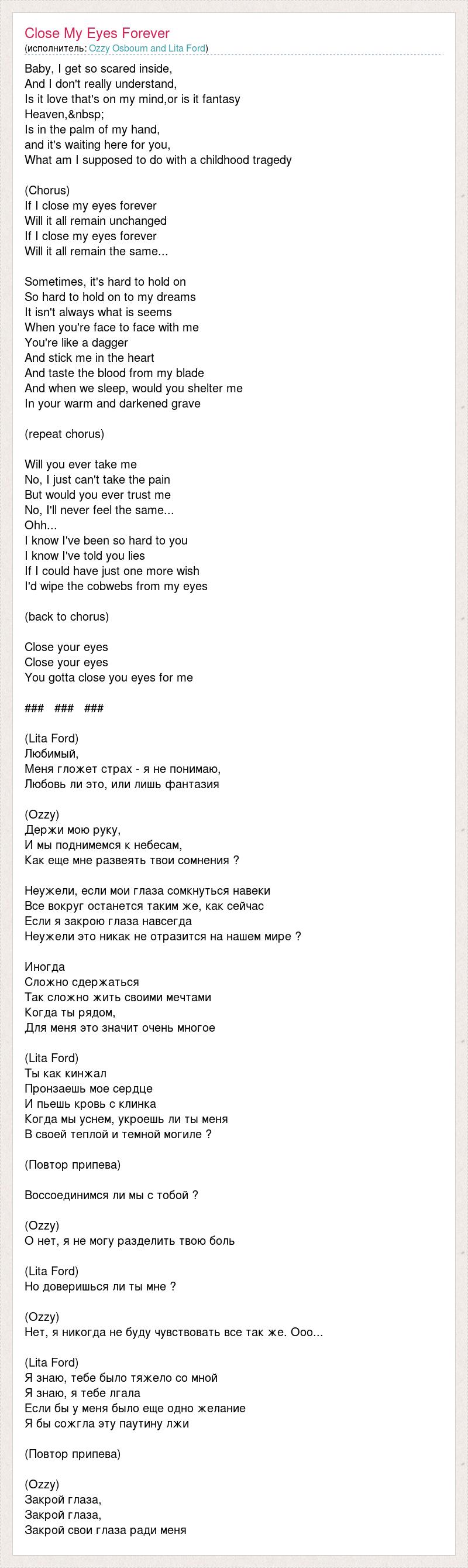 Baby, I get so scared inside, And I don't really understand, Is it love that's on my mind,or is it fantasy Heaven, Is in the palm of my hand, and it's waiting here for you, What am I supposed to do with a childhood tragedy (Chorus) If I close my eyes forever Will it all remain unchanged If I close my eyes forever Will it all remain the same... Sometimes, it's hard to hold on So hard to hold on to my dreams It isn't always what is seems When you're face to face with me You're like a dagger And stick me in the heart And taste the blood from my blade And when we sleep, would you shelter me In your warm and darkened grave (repeat chorus) Will you ever take me No, I just can't take the pain But would you ever trust me No, I'll never feel the same... Ohh... I know I've been so hard to you I know I've told you lies If I could have just one more wish I'd wipe the cobwebs from my eyes (back to chorus) Close your eyes Close your eyes You gotta close you eyes for me ### ### ### (Lita Ford) Любимый, Меня гложет страх - я не понимаю, Любовь ли это, или лишь фантазия (Ozzy) Держи мою руку, И мы поднимемся к небесам, Как еще мне развеять твои сомнения ? Неужели, если мои глаза сомкнуться навеки Все вокруг останется таким же, как сейчас Если я закрою глаза навсегда Неужели это никак не отразится на нашем мире ? Иногда Сложно сдержаться Так сложно жить своими мечтами Когда ты рядом, Для меня это значит очень многое (Lita Ford) Ты как кинжал Пронзаешь мое сердце И пьешь кровь с клинка Когда мы уснем, укроешь ли ты меня В своей теплой и темной могиле ? (Повтор припева) Воссоединимся ли мы с тобой ? (Ozzy) О нет, я не могу разделить твою боль (Lita Ford) Но доверишься ли ты мне ? (Ozzy) Нет, я никогда не буду чувствовать все так же. Oоо... (Lita Ford) Я знаю, тебе было тяжело со мной Я знаю, я тебе лгала Если бы у меня было еще одно желание Я бы сожгла эту паутину лжи (Повтор припева) (Ozzy) Закрой глаза, Закрой глаза, Закрой свои глаза ради меня