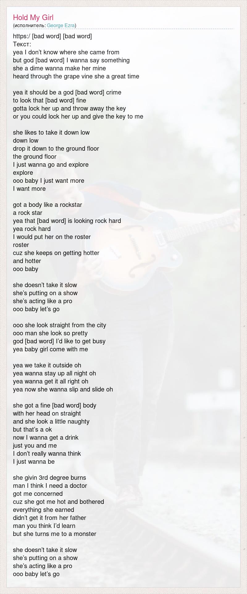 https:/ [bad word] [bad word] Текст: yea I don’t know where she came from but god [bad word] I wanna say something she a dime wanna make her mine heard through the grape vine she a great time yea it should be a god [bad word] crime to look that [bad word] fine gotta lock her up and throw away the key or you could lock her up and give the key to me she likes to take it down low down low drop it down to the ground floor the ground floor I just wanna go and explore explore ooo baby I just want more I want more got a body like a rockstar a rock star yea that [bad word] is looking rock hard yea rock hard I would put her on the roster roster cuz she keeps on getting hotter and hotter ooo baby she doesn’t take it slow she’s putting on a show she’s acting like a pro ooo baby let’s go ooo she look straight from the city ooo man she look so pretty god [bad word] I’d like to get busy yea baby girl come with me yea we take it outside oh yea wanna stay up all night oh yea wanna get it all right oh yea now she wanna slip and slide oh she got a fine [bad word] body with her head on straight and she look a little naughty but that’s a ok now I wanna get a drink just you and me I don’t really wanna think I just wanna be she givin 3rd degree burns man I think I need a doctor got me concerned cuz she got me hot and bothered everything she earned didn’t get it from her father man you think I’d learn but she turns me to a monster she doesn’t take it slow she’s putting on a show she’s acting like a pro ooo baby let’s go