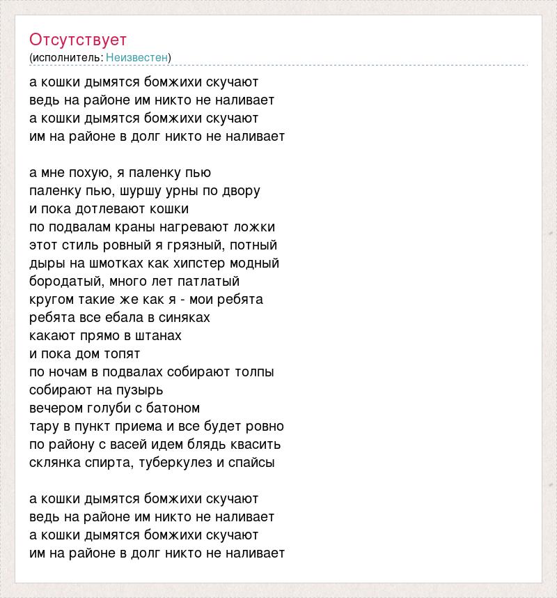 а кошки дымятся бомжихи скучают ведь на районе им никто не наливает а кошки дымятся бомжихи скучают им на районе в долг никто не наливает а мне похую, я паленку пью паленку пью, шуршу урны по двору и пока дотлевают кошки по подвалам краны нагревают ложки этот стиль ровный я грязный, потный дыры на шмотках как хипстер модный бородатый, много лет патлатый кругом такие же как я - мои ребята ребята все ебала в синяках какают прямо в штанах и пока дом топят по ночам в подвалах собирают толпы собирают на пузырь вечером голуби с батоном тару в пункт приема и все будет ровно по району с васей идем блядь квасить склянка спирта, туберкулез и спайсы а кошки дымятся бомжихи скучают ведь на районе им никто не наливает а кошки дымятся бомжихи скучают им на районе в долг никто не наливает