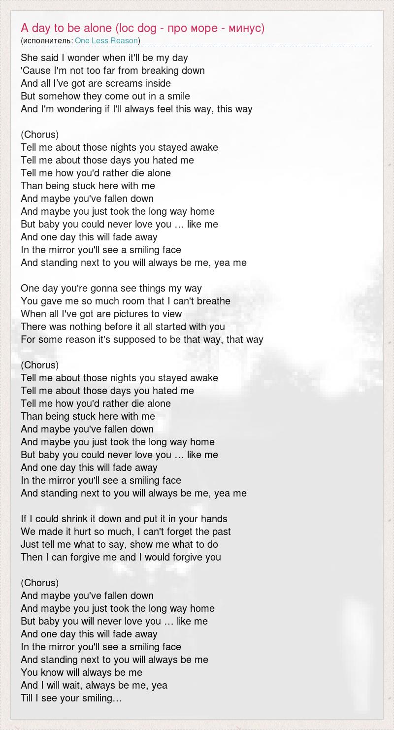 She said I wonder when it'll be my day 'Cause I'm not too far from breaking down And all I’ve got are screams inside But somehow they come out in a smile And I'm wondering if I'll always feel this way, this way (Chorus) Tell me about those nights you stayed awake Tell me about those days you hated me Tell me how you'd rather die alone Than being stuck here with me And maybe you've fallen down And maybe you just took the long way home But baby you could never love you … like me And one day this will fade away In the mirror you'll see a smiling face And standing next to you will always be me, yea me One day you're gonna see things my way You gave me so much room that I can't breathe When all I've got are pictures to view There was nothing before it all started with you For some reason it's supposed to be that way, that way (Chorus) Tell me about those nights you stayed awake Tell me about those days you hated me Tell me how you'd rather die alone Than being stuck here with me And maybe you've fallen down And maybe you just took the long way home But baby you could never love you … like me And one day this will fade away In the mirror you'll see a smiling face And standing next to you will always be me, yea me If I could shrink it down and put it in your hands We made it hurt so much, I can't forget the past Just tell me what to say, show me what to do Then I can forgive me and I would forgive you (Chorus) And maybe you've fallen down And maybe you just took the long way home But baby you will never love you … like me And one day this will fade away In the mirror you'll see a smiling face And standing next to you will always be me You know will always be me And I will wait, always be me, yea Till I see your smiling…