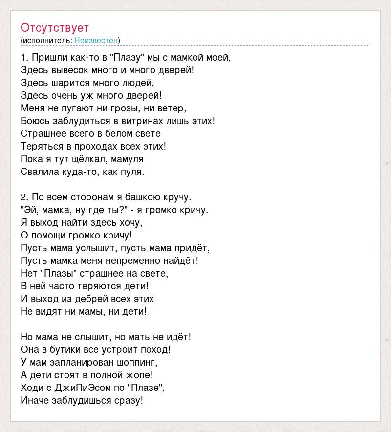 1. Пришли как-то в "Плазу" мы с мамкой моей, Здесь вывесок много и много дверей! Здесь шарится много людей, Здесь очень уж много дверей! Меня не пугают ни грозы, ни ветер, Боюсь заблудиться в витринах лишь этих! Страшнее всего в белом свете Теряться в проходах всех этих! Пока я тут щёлкал, мамуля Свалила куда-то, как пуля. 2. По всем сторонам я башкою кручу. "Эй, мамка, ну где ты?" - я громко кричу. Я выход найти здесь хочу, О помощи громко кричу! Пусть мама услышит, пусть мама придёт, Пусть мамка меня непременно найдёт! Нет "Плазы" страшнее на свете, В ней часто теряются дети! И выход из дебрей всех этих Не видят ни мамы, ни дети! Но мама не слышит, но мать не идёт! Она в бутики все устроит поход! У мам запланирован шоппинг, А дети стоят в полной жопе! Ходи с ДжиПиЭсом по "Плазе", Иначе заблудишься сразу!