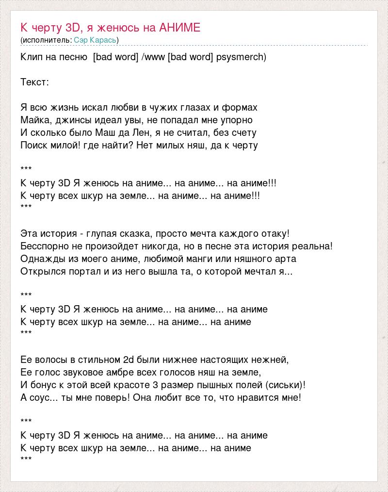 Клип на песню [bad word] /www [bad word] psysmerch) Текст: Я всю жизнь искал любви в чужих глазах и формах Майка, джинсы идеал увы, не попадал мне упорно И сколько было Маш да Лен, я не считал, без счету Поиск милой! где найти? Нет милых няш, да к черту *** К черту 3D Я женюсь на аниме... на аниме... на аниме!!! К черту всех шкур на земле... на аниме... на аниме!!! *** Эта история - глупая сказка, просто мечта каждого отаку! Бесспорно не произойдет никогда, но в песне эта история реальна! Однажды из моего аниме, любимой манги или няшного арта Открылся портал и из него вышла та, о которой мечтал я... *** К черту 3D Я женюсь на аниме... на аниме... на аниме К черту всех шкур на земле... на аниме... на аниме *** Ее волосы в стильном 2d были нижнее настоящих нежней, Ее голос звуковое амбре всех голосов няш на земле, И бонус к этой всей красоте 3 размер пышных полей (сиськи)! А соус... ты мне поверь! Она любит все то, что нравится мне! *** К черту 3D Я женюсь на аниме... на аниме... на аниме К черту всех шкур на земле... на аниме... на аниме ***