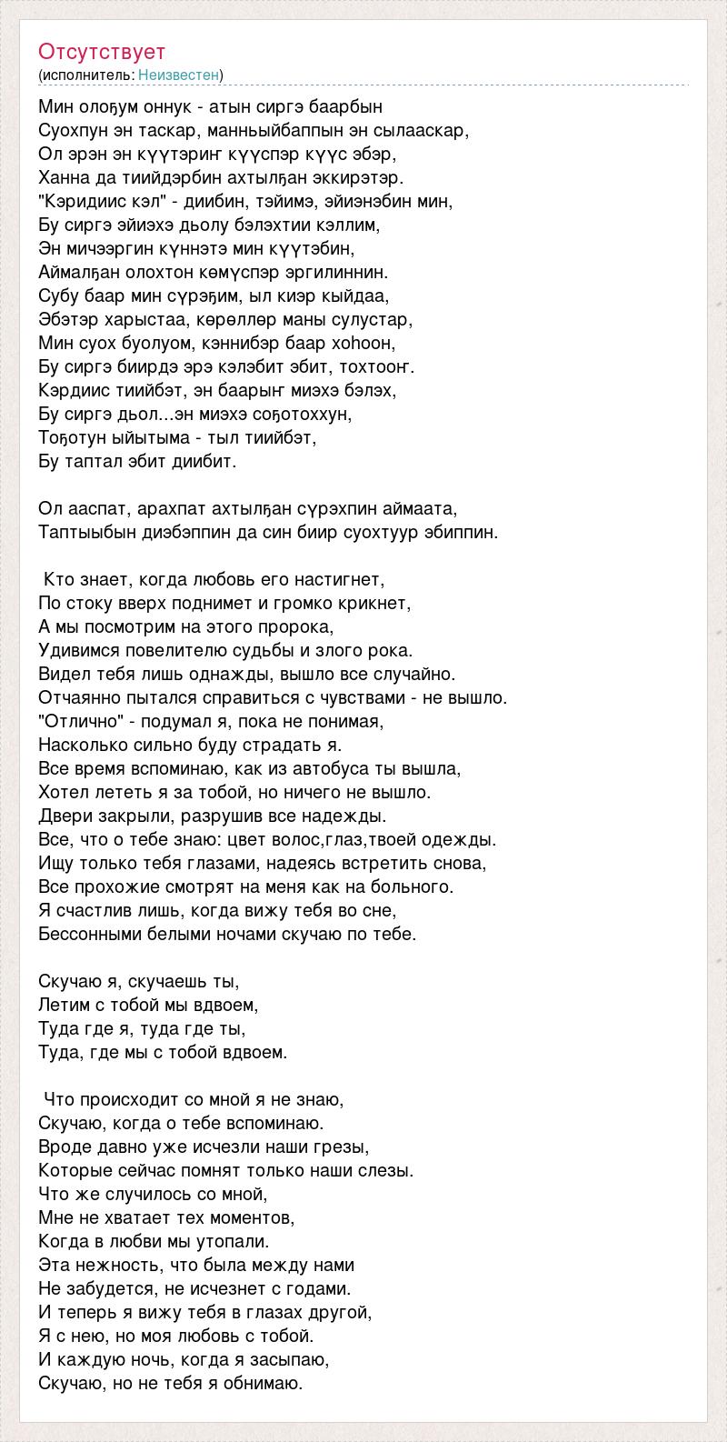 Мин олоҕум оннук - атын сиргэ баарбын Суохпун эн таскар, манньыйбаппын эн сылааскар, Ол эрэн эн күүтэриҥ күүспэр күүс эбэр, Ханна да тиийдэрбин ахтылҕан эккирэтэр. "Кэридиис кэл" - диибин, тэйимэ, эйиэнэбин мин, Бу сиргэ эйиэхэ дьолу бэлэхтии кэллим, Эн мичээргин күннэтэ мин күүтэбин, Аймалҕан олохтон көмүспэр эргилиннин. Субу баар мин сүрэҕим, ыл киэр кыйдаа, Эбэтэр харыстаа, көрөллөр маны сулустар, Мин суох буолуом, кэннибэр баар хоhоон, Бу сиргэ биирдэ эрэ кэлэбит эбит, тохтооҥ. Кэрдиис тиийбэт, эн баарыҥ миэхэ бэлэх, Бу сиргэ дьол...эн миэхэ соҕотоххун, Тоҕотун ыйытыма - тыл тиийбэт, Бу таптал эбит диибит. Ол ааспат, арахпат ахтылҕан сүрэхпин аймаата, Таптыыбын диэбэппин да син биир суохтуур эбиппин. Кто знает, когда любовь его настигнет, По стоку вверх поднимет и громко крикнет, А мы посмотрим на этого пророка, Удивимся повелителю судьбы и злого рока. Видел тебя лишь однажды, вышло все случайно. Отчаянно пытался справиться с чувствами - не вышло. "Отлично" - подумал я, пока не понимая, Насколько сильно буду страдать я. Все время вспоминаю, как из автобуса ты вышла, Хотел лететь я за тобой, но ничего не вышло. Двери закрыли, разрушив все надежды. Все, что о тебе знаю: цвет волос,глаз,твоей одежды. Ищу только тебя глазами, надеясь встретить снова, Все прохожие смотрят на меня как на больного. Я счастлив лишь, когда вижу тебя во сне, Бессонными белыми ночами скучаю по тебе. Скучаю я, скучаешь ты, Летим с тобой мы вдвоем, Туда где я, туда где ты, Туда, где мы с тобой вдвоем. Что происходит со мной я не знаю, Скучаю, когда о тебе вспоминаю. Вроде давно уже исчезли наши грезы, Которые сейчас помнят только наши слезы. Что же случилось со мной, Мне не хватает тех моментов, Когда в любви мы утопали. Эта нежность, что была между нами Не забудется, не исчезнет с годами. И теперь я вижу тебя в глазах другой, Я с нею, но моя любовь с тобой. И каждую ночь, когда я засыпаю, Скучаю, но не тебя я обнимаю.