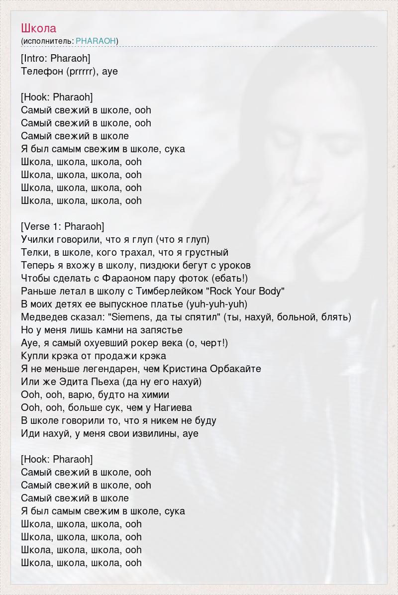 [Intro: Pharaoh] Телефон (prrrrr), aye [Hook: Pharaoh] Самый свежий в школе, ooh Самый свежий в школе, ooh Самый свежий в школе Я был самым свежим в школе, сука Школа, школа, школа, ooh Школа, школа, школа, ooh Школа, школа, школа, ooh Школа, школа, школа, ooh [Verse 1: Pharaoh] Училки говорили, что я глуп (что я глуп) Телки, в школе, кого трахал, что я грустный Теперь я вхожу в школу, пиздюки бегут с уроков Чтобы сделать с Фараоном пару фоток (ебать!) Раньше летал в школу с Тимберлейком "Rock Your Body" В моих детях ее выпускное платье (yuh-yuh-yuh) Медведев сказал: "Siemens, да ты спятил" (ты, нахуй, больной, блять) Но у меня лишь камни на запястье Aye, я самый охуевший рокер века (о, черт!) Купли крэка от продажи крэка Я не меньше легендарен, чем Кристина Орбакайте Или же Эдита Пьеха (да ну его нахуй) Ooh, ooh, варю, будто на химии Ooh, ooh, больше сук, чем у Нагиева В школе говорили то, что я никем не буду Иди нахуй, у меня свои извилины, aye [Hook: Pharaoh] Самый свежий в школе, ooh Самый свежий в школе, ooh Самый свежий в школе Я был самым свежим в школе, сука Школа, школа, школа, ooh Школа, школа, школа, ooh Школа, школа, школа, ooh Школа, школа, школа, ooh