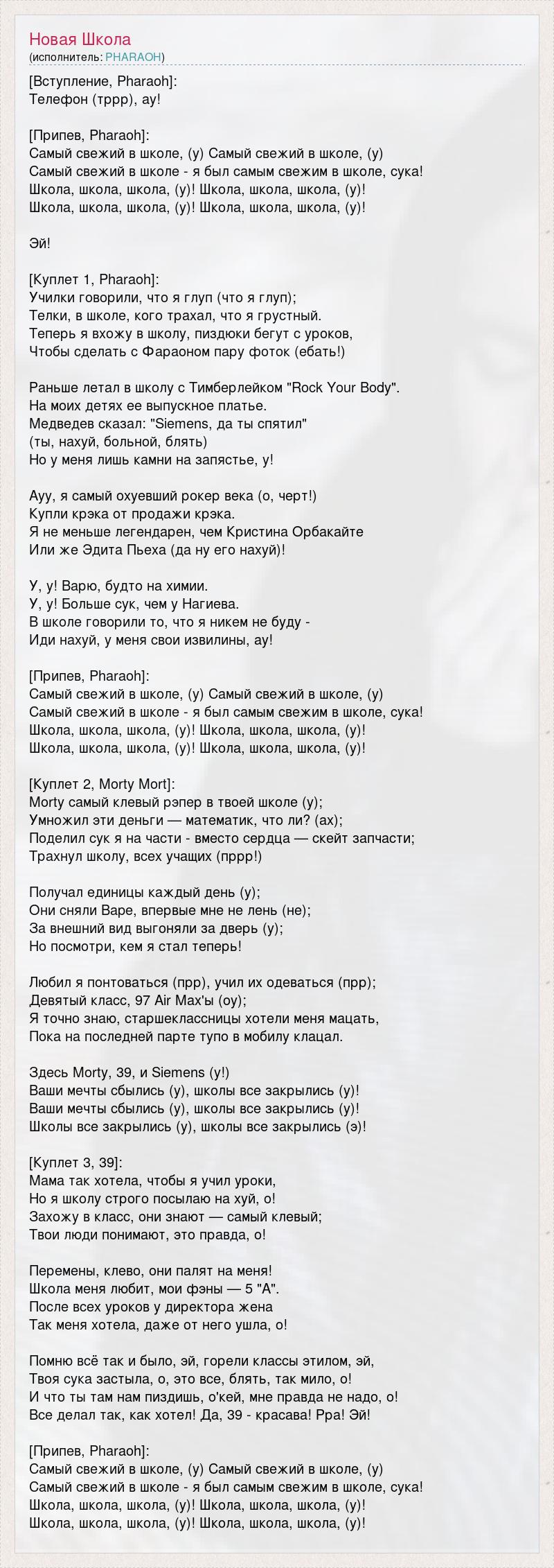 [Вступление, Pharaoh]: Телефон (тррр), ay! [Припев, Pharaoh]: Самый свежий в школе, (у) Самый свежий в школе, (у) Самый свежий в школе - я был самым свежим в школе, сука! Школа, школа, школа, (у)! Школа, школа, школа, (у)! Школа, школа, школа, (у)! Школа, школа, школа, (у)! Эй! [Куплет 1, Pharaoh]: Училки говорили, что я глуп (что я глуп); Телки, в школе, кого трахал, что я грустный. Теперь я вхожу в школу, пиздюки бегут с уроков, Чтобы сделать с Фараоном пару фоток (ебать!) Раньше летал в школу с Тимберлейком "Rock Your Body". На моих детях ее выпускное платье. Медведев сказал: "Siemens, да ты спятил" (ты, нахуй, больной, блять) Но у меня лишь камни на запястье, у! Ayy, я самый охуевший рокер века (о, черт!) Купли крэка от продажи крэка. Я не меньше легендарен, чем Кристина Орбакайте Или же Эдита Пьеха (да ну его нахуй)! У, у! Варю, будто на химии. У, у! Больше сук, чем у Нагиева. В школе говорили то, что я никем не буду - Иди нахуй, у меня свои извилины, ay! [Припев, Pharaoh]: Самый свежий в школе, (у) Самый свежий в школе, (у) Самый свежий в школе - я был самым свежим в школе, сука! Школа, школа, школа, (у)! Школа, школа, школа, (у)! Школа, школа, школа, (у)! Школа, школа, школа, (у)! [Куплет 2, Morty Mort]: Morty самый клевый рэпер в твоей школе (у); Умножил эти деньги — математик, что ли? (ах); Поделил сук я на части - вместо сердца — скейт запчасти; Трахнул школу, всех учащих (пррр!) Получал единицы каждый день (у); Они сняли Bape, впервые мне не лень (не); За внешний вид выгоняли за дверь (у); Но посмотри, кем я стал теперь! Любил я понтоваться (прр), учил их одеваться (прр); Девятый класс, 97 Air Max'ы (оу); Я точно знаю, старшеклассницы хотели меня мацать, Пока на последней парте тупо в мобилу клацал. Здесь Morty, 39, и Siemens (у!) Ваши мечты сбылись (y), школы все закрылись (у)! Ваши мечты сбылись (y), школы все закрылись (у)! Школы все закрылись (у), школы все закрылись (э)! [Куплет 3, 39]: Мама так хотела, чтобы я учил уроки, Но я школу строго посылаю на хуй, о! Захожу в класс, они знают — самый клевый; Твои люди понимают, это правда, о! Перемены, клево, они палят на меня! Школа меня любит, мои фэны — 5 "А". После всех уроков у директора жена Так меня хотела, даже от него ушла, о! Помню всё так и было, эй, горели классы этилом, эй, Твоя сука застыла, о, это все, блять, так мило, о! И что ты там нам пиздишь, о'кей, мне правда не надо, о! Все делал так, как хотел! Да, 39 - красава! Рра! Эй! [Припев, Pharaoh]: Самый свежий в школе, (у) Самый свежий в школе, (у) Самый свежий в школе - я был самым свежим в школе, сука! Школа, школа, школа, (у)! Школа, школа, школа, (у)! Школа, школа, школа, (у)! Школа, школа, школа, (у)!