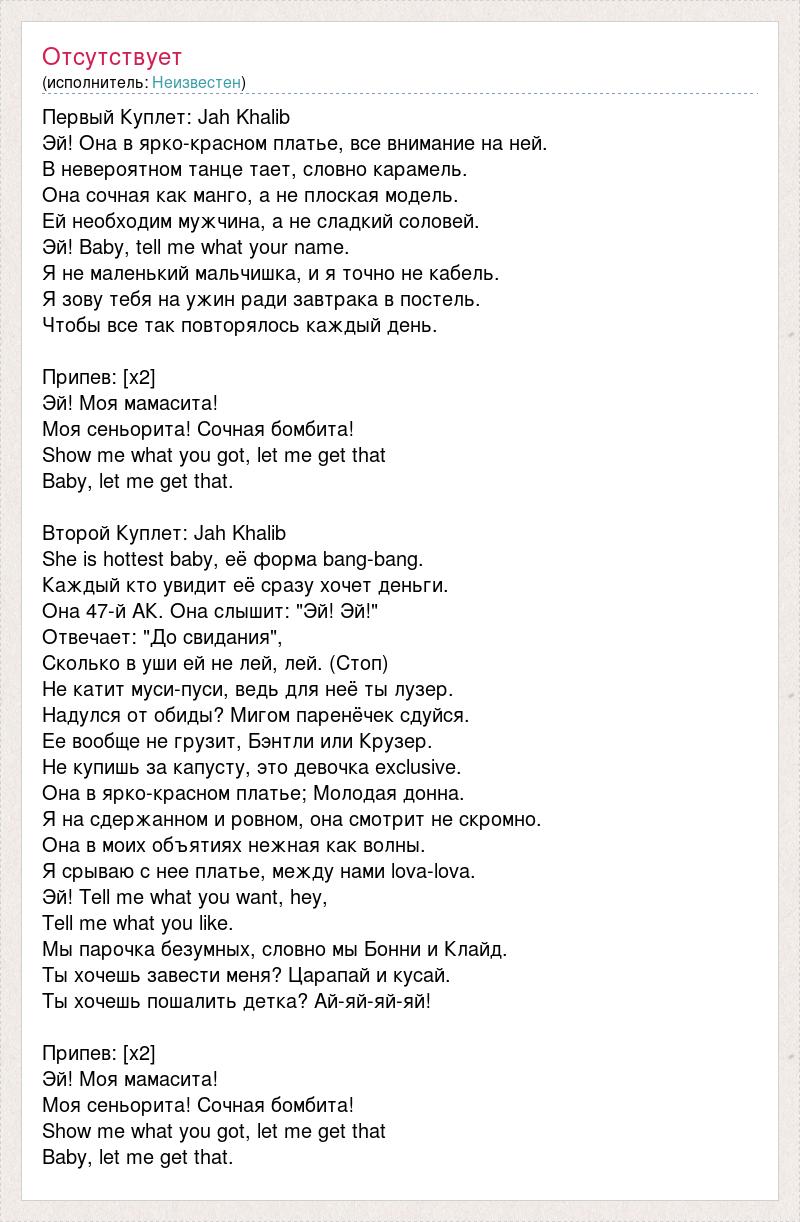 Первый Куплет: Jah Khalib Эй! Она в ярко-красном платье, все внимание на ней. В невероятном танце тает, словно карамель. Она сочная как манго, а не плоская модель. Ей необходим мужчина, а не сладкий соловей. Эй! Baby, tell me what your name. Я не маленький мальчишка, и я точно не кабель. Я зову тебя на ужин ради завтрака в постель. Чтобы все так повторялось каждый день. Припев: [x2] Эй! Моя мамасита! Моя сеньорита! Сочная бомбита! Show me what you got, let me get that Baby, let me get that. Второй Куплет: Jah Khalib She is hottest baby, её форма bang-bang. Каждый кто увидит её сразу хочет деньги. Она 47-й АК. Она слышит: "Эй! Эй!" Отвечает: "До свидания", Сколько в уши ей не лей, лей. (Стоп) Не катит муси-пуси, ведь для неё ты лузер. Надулся от обиды? Мигом паренёчек сдуйся. Ее вообще не грузит, Бэнтли или Крузер. Не купишь за капусту, это девочка exclusive. Она в ярко-красном платье; Молодая донна. Я на сдержанном и ровном, она смотрит не скромно. Она в моих объятиях нежная как волны. Я срываю с нее платье, между нами lova-lova. Эй! Tell me what you want, hey, Tell me what you like. Мы парочка безумных, словно мы Бонни и Клайд. Ты хочешь завести меня? Царапай и кусай. Ты хочешь пошалить детка? Ай-яй-яй-яй! Припев: [x2] Эй! Моя мамасита! Моя сеньорита! Сочная бомбита! Show me what you got, let me get that Baby, let me get that.