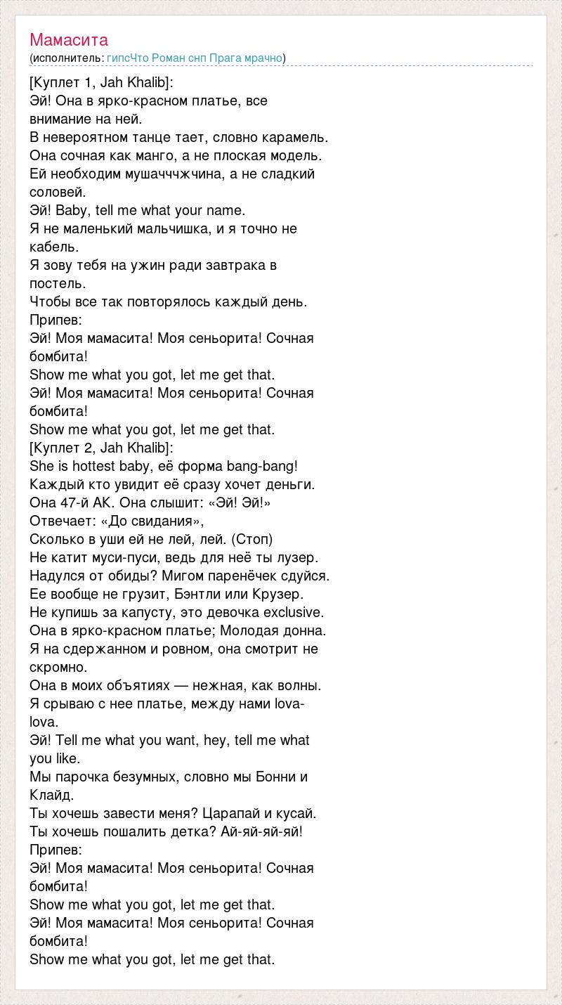 [Куплет 1, Jah Khalib]: Эй! Она в ярко-красном платье, все внимание на ней. В невероятном танце тает, словно карамель. Она сочная как манго, а не плоская модель. Ей необходим мушачччжчина, а не сладкий соловей. Эй! Baby, tell me what your name. Я не маленький мальчишка, и я точно не кабель. Я зову тебя на ужин ради завтрака в постель. Чтобы все так повторялось каждый день. Припев: Эй! Моя мамасита! Моя сеньорита! Сочная бомбита! Show me what you got, let me get that. Эй! Моя мамасита! Моя сеньорита! Сочная бомбита! Show me what you got, let me get that. [Куплет 2, Jah Khalib]: She is hottest baby, её форма bang-bang! Каждый кто увидит её сразу хочет деньги. Она 47-й АК. Она слышит: «Эй! Эй!» Отвечает: «До свидания», Сколько в уши ей не лей, лей. (Стоп) Не катит муси-пуси, ведь для неё ты лузер. Надулся от обиды? Мигом паренёчек сдуйся. Ее вообще не грузит, Бэнтли или Крузер. Не купишь за капусту, это девочка exclusive. Она в ярко-красном платье; Молодая донна. Я на сдержанном и ровном, она смотрит не скромно. Она в моих объятиях — нежная, как волны. Я срываю с нее платье, между нами lova- lova. Эй! Tell me what you want, hey, tell me what you like. Мы парочка безумных, словно мы Бонни и Клайд. Ты хочешь завести меня? Царапай и кусай. Ты хочешь пошалить детка? Ай-яй-яй-яй! Припев: Эй! Моя мамасита! Моя сеньорита! Сочная бомбита! Show me what you got, let me get that. Эй! Моя мамасита! Моя сеньорита! Сочная бомбита! Show me what you got, let me get that.
