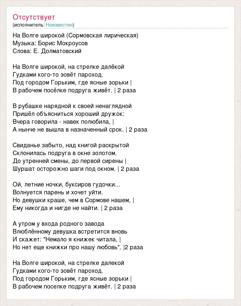 На Волге широкой (Сормовская лирическая) Музыка: Борис Мокроусов Слова: Е. Долматовский На Волге широкой, на cтрелке далёкой Гудками кого-то зовёт пароход. Под городом Горьким, где ясные зорьки | В рабочем посёлке подруга живёт. | 2 раза В рубашке нарядной к своей ненаглядной Пришёл объясниться хороший дружок: Вчера говорила - навек полюбила, | А нынче не вышла в назначенный срок. | 2 раза Свиданье забыто, над книгой раскрытой Склонилась подруга в окне золотом. До утренней смены, до первой сирены | Шуршат осторожно шаги под окном. | 2 раза Ой, летние ночки, буксиров гудочки... Волнуется парень и хочет уйти. Но девушки краше, чем в Сормове нашем, | Ему никогда и нигде не найти. | 2 раза А утром у входа родного завода Влюблённому девушка встретится вновь И скажет: "Немало я книжек читала, | Но нет еще книжки про нашу любовь". |2 раза На Волге широкой, на cтрелке далекой Гудками кого-то зовёт пароход. Под городом Горьким, где ясные зорьки | В рабочем поселке подруга живёт. | 2 раза