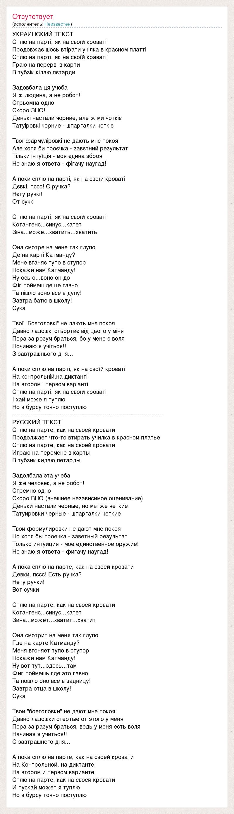 УКРАИНСКИЙ ТЕКСТ Сплю на парті, як на своїй кроваті Продовжає шось втірати учілка в красном платті Сплю на парті, як на своїй краваті Граю на перерві в карти В тубзік кідаю пєтарди Задовбала ця учоба Я ж людина, а не робот! Стрьомна одно Скоро ЗНО! Денькі настали чорние, але ж ми чоткіє Татуіровкі чорние - шпаргалки чоткіє Твої фармуліровкі не дають мнє покоя Але хотя би троєчка - завєтний результат Тільки інтуїція - моя єдина зброя Не знаю я ответа - фігачу наугад! А поки сплю на парті, як на своїй кроваті Дєвкі, пссс! Є ручка? Нєту ручкі! От сучкі Сплю на парті, як на своїй кроваті Котангенс...синус...катет Зіна...може...хватить...хватить Она смотре на мене так глупо Де на карті Катманду? Мене вганяє тупо в ступор Покажи нам Катманду! Ну ось о...воно он до Фіг поймеш де це гавно Та пішло воно все в дупу! Завтра батю в школу! Сука Твої "Боєголовкі" не дають мнє покоя Давно ладошкі стьортиє від цього у міня Пора за розум браться, бо у мене є воля Починаю я учіться!! З завтрашнього дня... А поки сплю на парті, як на своїй кроваті На контрольній,на диктанті На втором і первом варіанті Сплю на парті, як на своїй кроваті І хай може я туплю Но в бурсу точно поступлю -------------------------------------------------------------------------- РУССКИЙ ТЕКСТ Сплю на парте, как на своей кровати Продолжает что-то втирать училка в красном платье Сплю на парте, как на своей кровати Играю на перемене в карты В тубзик кидаю петарды Задолбала эта учеба Я же человек, а не робот! Стремно одно Скоро ВНО (внешнее независимое оценивание) Деньки настали черные, но мы же четкие Татуировки черные - шпаргалки четкие Твои формулировки не дают мне покоя Но хотя бы троечка - заветный результат Только интуиция - мое единственное оружие! Не знаю я ответа - фигачу наугад! А пока сплю на парте, как на своей кровати Девки, пссс! Есть ручка? Нету ручки! Вот сучки Сплю на парте, как на своей кровати Котангенс...синус...катет Зина...может...хватит...хватит Она смотрит на меня так глупо Где на карте Катманду? Меня вгоняет тупо в ступор Покажи нам Катманду! Ну вот тут...здесь...там Фиг поймешь где это гавно Та пошло оно все в задницу! Завтра отца в школу! Сука Твои "боеголовки" не дают мне покоя Давно ладошки стертые от этого у меня Пора за разум браться, ведь у меня есть воля Начиная я учиться!! С завтрашнего дня... А пока сплю на парте, как на своей кровати На Контрольной, на диктанте На втором и первом варианте Сплю на парте, как на своей кровати И пускай может я туплю Но в бурсу точно поступлю