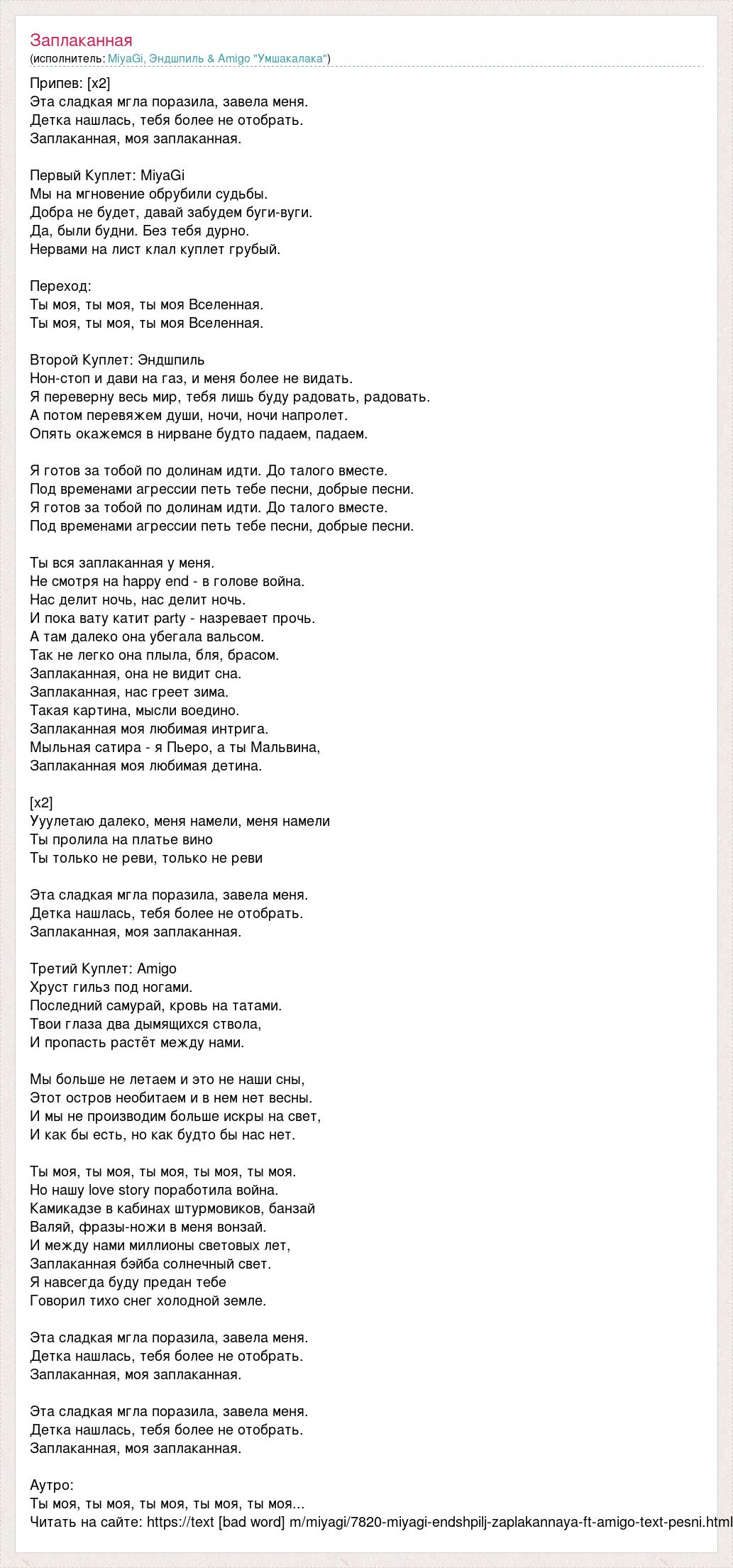 Припев: [x2] Эта сладкая мгла поразила, завела меня. Детка нашлась, тебя более не отобрать. Заплаканная, моя заплаканная. Первый Куплет: MiyaGi Мы на мгновение обрубили судьбы. Добра не будет, давай забудем буги-вуги. Да, были будни. Без тебя дурно. Нервами на лист клал куплет грубый. Переход: Ты моя, ты моя, ты моя Вселенная. Ты моя, ты моя, ты моя Вселенная. Второй Куплет: Эндшпиль Нон-стоп и дави на газ, и меня более не видать. Я переверну весь мир, тебя лишь буду радовать, радовать. А потом перевяжем души, ночи, ночи напролет. Опять окажемся в нирване будто падаем, падаем. Я готов за тобой по долинам идти. До талого вместе. Под временами агрессии петь тебе песни, добрые песни. Я готов за тобой по долинам идти. До талого вместе. Под временами агрессии петь тебе песни, добрые песни. Ты вся заплаканная у меня. Не смотря на happy end - в голове война. Нас делит ночь, нас делит ночь. И пока вату катит party - назревает прочь. А там далеко она убегала вальсом. Так не легко она плыла, бля, брасом. Заплаканная, она не видит сна. Заплаканная, нас греет зима. Такая картина, мысли воедино. Заплаканная моя любимая интрига. Мыльная сатира - я Пьеро, а ты Мальвина, Заплаканная моя любимая детина. [x2] Ууулетаю далеко, меня намели, меня намели Ты пролила на платье вино Ты только не реви, только не реви Эта сладкая мгла поразила, завела меня. Детка нашлась, тебя более не отобрать. Заплаканная, моя заплаканная. Третий Куплет: Amigo Хруст гильз под ногами. Последний самурай, кровь на татами. Твои глаза два дымящихся ствола, И пропасть растёт между нами. Мы больше не летаем и это не наши сны, Этот остров необитаем и в нем нет весны. И мы не производим больше искры на свет, И как бы есть, но как будто бы нас нет. Ты моя, ты моя, ты моя, ты моя, ты моя. Но нашу love story поработила война. Камикадзе в кабинах штурмовиков, банзай Валяй, фразы-ножи в меня вонзай. И между нами миллионы световых лет, Заплаканная бэйба солнечный свет. Я навсегда буду предан тебе Говорил тихо снег холодной земле. Эта сладкая мгла поразила, завела меня. Детка нашлась, тебя более не отобрать. Заплаканная, моя заплаканная. Эта сладкая мгла поразила, завела меня. Детка нашлась, тебя более не отобрать. Заплаканная, моя заплаканная. Аутро: Ты моя, ты моя, ты моя, ты моя, ты моя... Читать на сайте: https://text [bad word] m/miyagi/7820-miyagi-endshpilj-zaplakannaya-ft-amigo-text-pesni.html