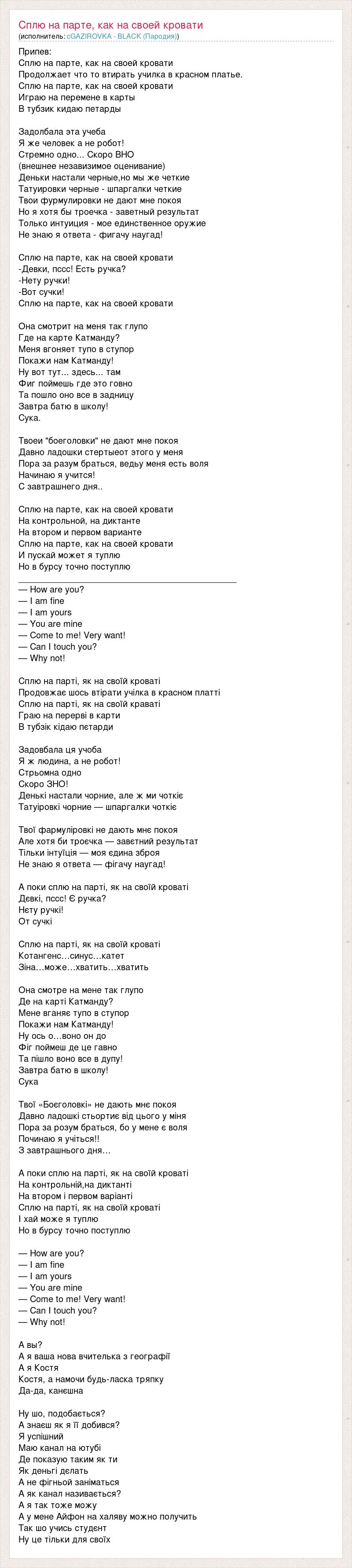 Припев: Сплю на парте, как на своей кровати Продолжает что то втирать училка в красном платье. Сплю на парте, как на своей кровати Играю на перемене в карты В тубзик кидаю петарды Задолбала эта учеба Я же человек а не робот! Стремно одно... Скоро ВНО (внешнее незавизимое оценивание) Деньки настали черные,но мы же четкие Татуировки черные - шпаргалки четкие Твои фурмулировки не дают мне покоя Но я хотя бы троечка - заветный результат Только интуиция - мое единственное оружие Не знаю я ответа - фигачу наугад! Сплю на парте, как на своей кровати -Девки, пссс! Есть ручка? -Нету ручки! -Вот сучки! Сплю на парте, как на своей кровати Она смотрит на меня так глупо Где на карте Катманду? Меня вгоняет тупо в ступор Покажи нам Катманду! Ну вот тут... здесь... там Фиг поймешь где это говно Та пошло оно все в задницу Завтра батю в школу! Сука. Твоеи "боеголовки" не дают мне покоя Давно ладошки стертыеот этого у меня Пора за разум браться, ведьу меня есть воля Начинаю я учится! С завтрашнего дня.. Сплю на парте, как на своей кровати На контрольной, на диктанте На втором и первом варианте Сплю на парте, как на своей кровати И пускай может я туплю Но в бурсу точно поступлю _____________________________________________ — How are you? — I am fine — I am yours — You are mine — Come to me! Very want! — Can I touch you? — Why not! Сплю на парті, як на своїй кроваті Продовжає шось втірати учілка в красном платті Сплю на парті, як на своїй краваті Граю на перерві в карти В тубзік кідаю пєтарди Задовбала ця учоба Я ж людина, а не робот! Стрьомна одно Скоро ЗНО! Денькі настали чорние, але ж ми чоткіє Татуіровкі чорние — шпаргалки чоткіє Твої фармуліровкі не дають мнє покоя Але хотя би троєчка — завєтний результат Тільки інтуїція — моя єдина зброя Не знаю я ответа — фігачу наугад! А поки сплю на парті, як на своїй кроваті Дєвкі, пссс! Є ручка? Нєту ручкі! От сучкі Сплю на парті, як на своїй кроваті Котангенс…синус…катет Зіна…може…хватить…хватить Она смотре на мене так глупо Де на карті Катманду? Мене вганяє тупо в ступор Покажи нам Катманду! Ну ось о…воно он до Фіг поймеш де це гавно Та пішло воно все в дупу! Завтра батю в школу! Сука Твої «Боєголовкі» не дають мнє покоя Давно ладошкі стьортиє від цього у міня Пора за розум браться, бо у мене є воля Починаю я учіться!! З завтрашнього дня… А поки сплю на парті, як на своїй кроваті На контрольній,на диктанті На втором і первом варіанті Сплю на парті, як на своїй кроваті І хай може я туплю Но в бурсу точно поступлю — How are you? — I am fine — I am yours — You are mine — Come to me! Very want! — Can I touch you? — Why not! А вы? А я ваша нова вчителька з географії А я Костя Костя, а намочи будь-ласка тряпку Да-да, канєшна Ну шо, подобається? А знаєш як я її добився? Я успішний Маю канал на ютубі Де показую таким як ти Як деньгі дєлать А не фігньой заніматься А як канал називається? А я так тоже можу А у мене Айфон на халяву можно получить Так шо учись студєнт Ну це тільки для своїх