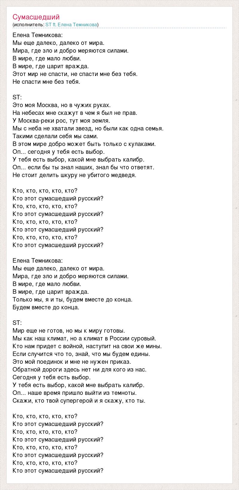 Елена Темникова: Мы еще далеко, далеко от мира. Мира, где зло и добро меряются силами. В мире, где мало любви. В мире, где царит вражда. Этот мир не спасти, не спасти мне без тебя. Не спасти мне без тебя. ST: Это моя Москва, но в чужих руках. На небесах мне скажут в чем я был не прав. У Москва-реки рос, тут моя земля. Мы с неба не хватали звезд, но были как одна семья. Такими сделали себя мы сами. В этом мире добро может быть только с кулаками. Оп... сегодня у тебя есть выбор. У тебя есть выбор, какой мне выбрать калибр. Оп... если бы ты знал наших, знал бы что ответят. Не стоит делить шкуру не убитого медведя. Кто, кто, кто, кто, кто? Кто этот сумасшедший русский? Кто, кто, кто, кто, кто? Кто этот сумасшедший русский? Кто, кто, кто, кто, кто? Кто этот сумасшедший русский? Кто, кто, кто, кто, кто? Кто этот сумасшедший русский? Елена Темникова: Мы еще далеко, далеко от мира. Мира, где зло и добро меряются силами. В мире, где мало любви. В мире, где царит вражда. Только мы, я и ты, будем вместе до конца. Будем вместе до конца. ST: Мир еще не готов, но мы к миру готовы. Мы как наш климат, но а климат в России суровый. Кто нам придет с войной, наступит на свои же мины. Если случится что то, знай, что мы будем едины. Это мой поединок и мне не нужен приказ. Обратной дороги здесь нет ни для кого из нас. Сегодня у тебя есть выбор. У тебя есть выбор, какой мне выбрать калибр. Оп... наше время пришло выйти из темноты. Скажи, кто твой супергерой и я скажу, кто ты. Кто, кто, кто, кто, кто? Кто этот сумасшедший русский? Кто, кто, кто, кто, кто? Кто этот сумасшедший русский? Кто, кто, кто, кто, кто? Кто этот сумасшедший русский? Кто, кто, кто, кто, кто? Кто этот сумасшедший русский?