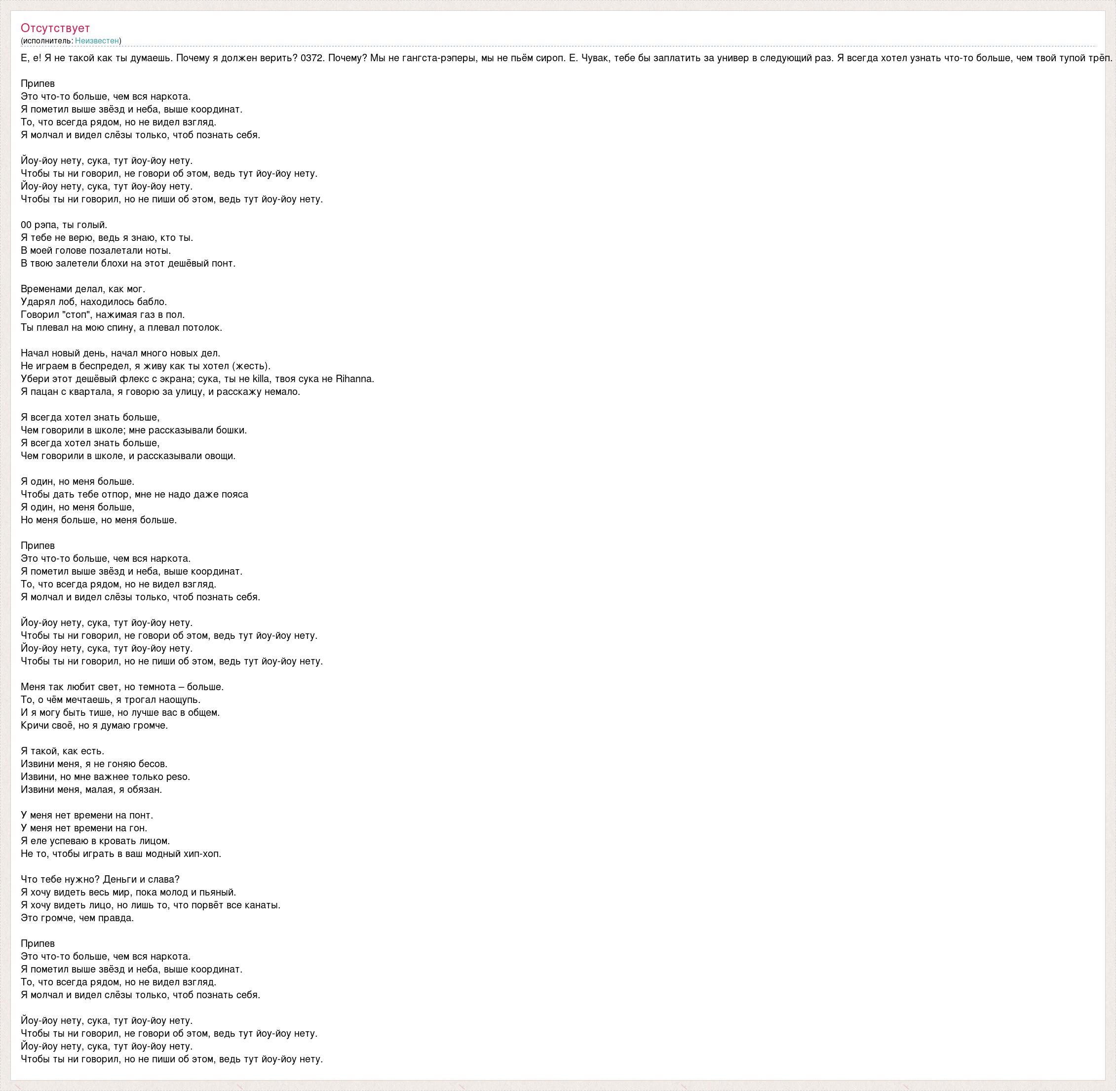 Е, е! Я не такой как ты думаешь. Почему я должен верить? 0372. Почему? Мы не гангста-рэперы, мы не пьём сироп. Е. Чувак, тебе бы заплатить за универ в следующий раз. Я всегда хотел узнать что-то больше, чем твой тупой трёп. Припев Это что-то больше, чем вся наркота. Я пометил выше звёзд и неба, выше координат. То, что всегда рядом, но не видел взгляд. Я молчал и видел слёзы только, чтоб познать себя. Йоу-йоу нету, сука, тут йоу-йоу нету. Чтобы ты ни говорил, не говори об этом, ведь тут йоу-йоу нету. Йоу-йоу нету, сука, тут йоу-йоу нету. Чтобы ты ни говорил, но не пиши об этом, ведь тут йоу-йоу нету. 00 рэпа, ты голый. Я тебе не верю, ведь я знаю, кто ты. В моей голове позалетали ноты. В твою залетели блохи на этот дешёвый понт. Временами делал, как мог. Ударял лоб, находилось бабло. Говорил "стоп", нажимая газ в пол. Ты плевал на мою спину, а плевал потолок. Начал новый день, начал много новых дел. Не играем в беспредел, я живу как ты хотел (жесть). Убери этот дешёвый флекс с экрана; сука, ты не killa, твоя сука не Rihanna. Я пацан с квартала, я говорю за улицу, и расскажу немало. Я всегда хотел знать больше, Чем говорили в школе; мне рассказывали бошки. Я всегда хотел знать больше, Чем говорили в школе, и рассказывали овощи. Я один, но меня больше. Чтобы дать тебе отпор, мне не надо даже пояса Я один, но меня больше, Но меня больше, но меня больше. Припев Это что-то больше, чем вся наркота. Я пометил выше звёзд и неба, выше координат. То, что всегда рядом, но не видел взгляд. Я молчал и видел слёзы только, чтоб познать себя. Йоу-йоу нету, сука, тут йоу-йоу нету. Чтобы ты ни говорил, не говори об этом, ведь тут йоу-йоу нету. Йоу-йоу нету, сука, тут йоу-йоу нету. Чтобы ты ни говорил, но не пиши об этом, ведь тут йоу-йоу нету. Меня так любит свет, но темнота – больше. То, о чём мечтаешь, я трогал наощупь. И я могу быть тише, но лучше вас в общем. Кричи своё, но я думаю громче. Я такой, как есть. Извини меня, я не гоняю бесов. Извини, но мне важнее только peso. Извини меня, малая, я обязан. У меня нет времени на понт. У меня нет времени на гон. Я еле успеваю в кровать лицом. Не то, чтобы играть в ваш модный хип-хоп. Что тебе нужно? Деньги и слава? Я хочу видеть весь мир, пока молод и пьяный. Я хочу видеть лицо, но лишь то, что порвёт все канаты. Это громче, чем правда. Припев Это что-то больше, чем вся наркота. Я пометил выше звёзд и неба, выше координат. То, что всегда рядом, но не видел взгляд. Я молчал и видел слёзы только, чтоб познать себя. Йоу-йоу нету, сука, тут йоу-йоу нету. Чтобы ты ни говорил, не говори об этом, ведь тут йоу-йоу нету. Йоу-йоу нету, сука, тут йоу-йоу нету. Чтобы ты ни говорил, но не пиши об этом, ведь тут йоу-йоу нету.