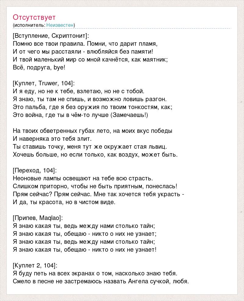 [Вступление, Скриптонит]: Помню все твои правила. Помни, что дарит пламя, И от чего мы расстаяли - влюбляйся без памяти! И твой маленький мир со мной качнётся, как маятник; Всё, подруга, bye! [Куплет, Truwer, 104]: И я еду, но не к тебе, взлетаю, но не с тобой. Я знаю, ты там не спишь, и возможно ловишь разгон. Это пальба, где я без оружия по твоим тонкостям, как; Это война, где ты в чём-то лучше (Замечаешь!) На твоих обветренных губах лето, на моих вкус победы И наверняка это тебя злит. Ты ставишь точку, меня тут же окружает стая львиц. Хочешь больше, но если только, как воздух, может быть. [Переход, 104]: Неоновые лампы освещают на тебе всю страсть. Слишком приторно, чтобы не быть приятным, понеслась! Прям сейчас? Прям сейчас. Мне так хочется тебя украсть - И да, ты красота, но в чистом виде. [Припев, Maqlao]: Я знаю какая ты, ведь между нами столько тайн; Я знаю какая ты, обещаю - никто о них не узнает; Я знаю какая ты, ведь между нами столько тайн; Я знаю какая ты, обещаю - никто о них не узнает! [Куплет 2, 104]: Я буду петь на всех экранах о том, насколько знаю тебя. Смело в песне не застремаюсь назвать Ангела сучкой, любя.