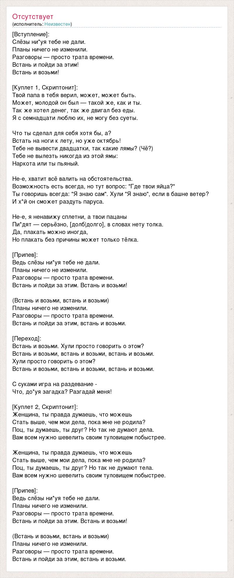 [Вступление]: Слёзы ни*уя тебе не дали. Планы ничего не изменили. Разговоры — просто трата времени. Встань и пойди за этим! Встань и возьми! [Куплет 1, Скриптонит]: Твой папа в тебя верил, может, может быть. Может, молодой он был — такой же, как и ты. Так же хотел денег, так же двигал без еды. Я с семнадцати люблю их, не могу без суеты. Что ты сделал для себя хотя бы, а? Встать на ноги к лету, но уже октябрь! Тебе не вывести двадцатки, так какие лямы? (Чё?) Тебе не вылезть никогда из этой ямы: Наркота или ты пьяный. Не-е, хватит всё валить на обстоятельства. Возможность есть всегда, но тут вопрос: "Где твои яйца?" Ты говоришь всегда: "Я знаю сам". Хули "Я знаю", если в башне ветер? И х*й он сможет раздуть паруса. Не-е, я ненавижу сплетни, а твои пацаны Пи*дят — серьёзно, [долб|долго], в словах нету толка. Да, плакать можно иногда, Но плакать без причины может только тёлка. [Припев]: Ведь слёзы ни*уя тебе не дали. Планы ничего не изменили. Разговоры — просто трата времени. Встань и пойди за этим. Встань и возьми! (Встань и возьми, встань и возьми) Планы ничего не изменили. Разговоры — просто трата времени. Встань и пойди за этим, встань и возьми. [Переход]: Встань и возьми. Хули просто говорить о этом? Встань и возьми, встань и возьми, встань и возьми. Хули просто говорить о этом? Встань и возьми, встань и возьми, встань и возьми. С суками игра на раздевание - Что, до*уя загадка? Разгадай меня! [Куплет 2, Скриптонит]: Женщина, ты правда думаешь, что можешь Стать выше, чем мои дела, пока мне не родила? Поц, ты думаешь, ты друг? Но так не думают дела. Вам всем нужно шевелить своим туловищем побыстрее. Женщина, ты правда думаешь, что можешь Стать выше, чем мои дела, пока мне не родила? Поц, ты думаешь, ты друг? Но так не думают тела. Вам всем нужно шевелить своим туловищем побыстрее. [Припев]: Ведь слёзы ни*уя тебе не дали. Планы ничего не изменили. Разговоры — просто трата времени. Встань и пойди за этим. Встань и возьми! (Встань и возьми, встань и возьми) Планы ничего не изменили. Разговоры — просто трата времени. Встань и пойди за этим, встань и возьми.