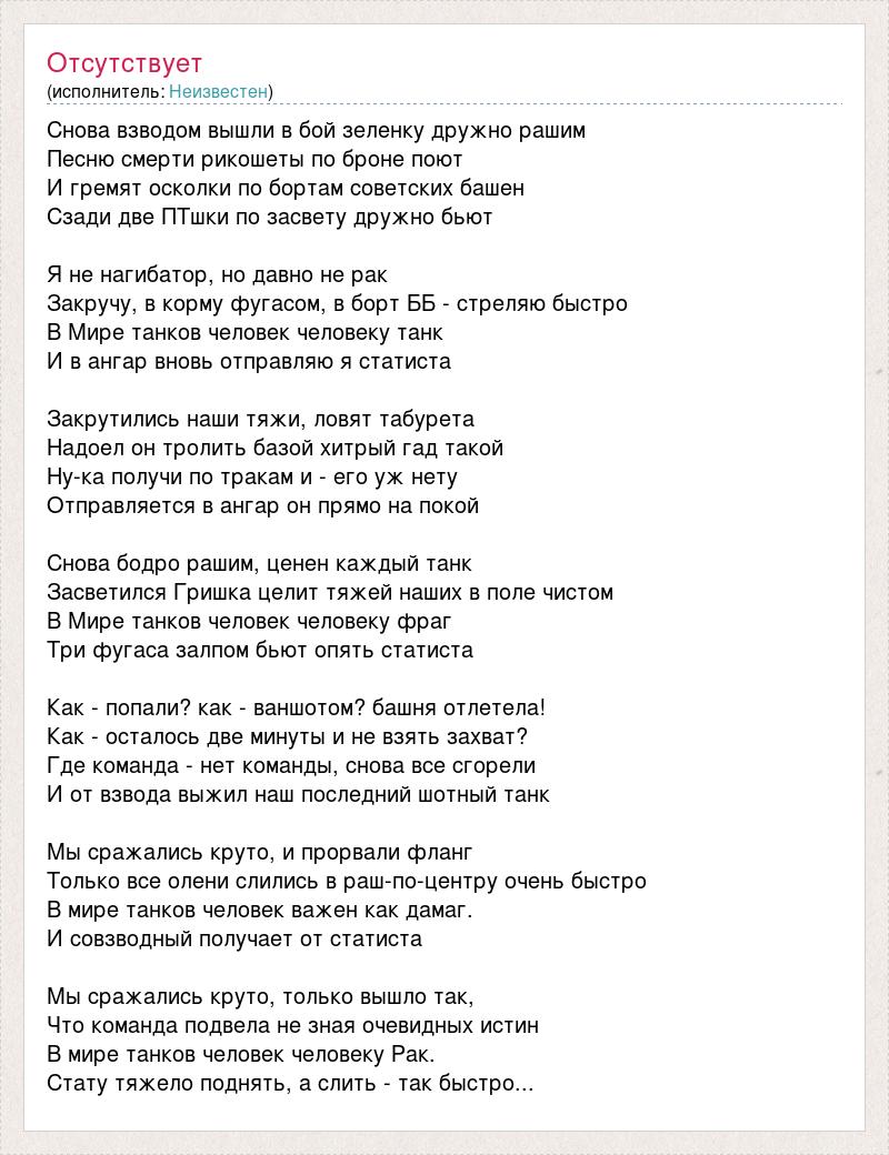 Снова взводом вышли в бой зеленку дружно рашим Песню смерти рикошеты по броне поют И гремят осколки по бортам советских башен Сзади две ПТшки по засвету дружно бьют Я не нагибатор, но давно не рак Закручу, в корму фугасом, в борт ББ - стреляю быстро В Мире танков человек человеку танк И в ангар вновь отправляю я статиста Закрутились наши тяжи, ловят табурета Надоел он тролить базой хитрый гад такой Ну-ка получи по тракам и - его уж нету Отправляется в ангар он прямо на покой Снова бодро рашим, ценен каждый танк Засветился Гришка целит тяжей наших в поле чистом В Мире танков человек человеку фраг Три фугаса залпом бьют опять статиста Как - попали? как - ваншотом? башня отлетела! Как - осталось две минуты и не взять захват? Где команда - нет команды, снова все сгорели И от взвода выжил наш последний шотный танк Мы сражались круто, и прорвали фланг Только все олени слились в раш-по-центру очень быстро В мире танков человек важен как дамаг. И совзводный получает от статиста Мы сражались круто, только вышло так, Что команда подвела не зная очевидных истин В мире танков человек человеку Рак. Стату тяжело поднять, а слить - так быстро...