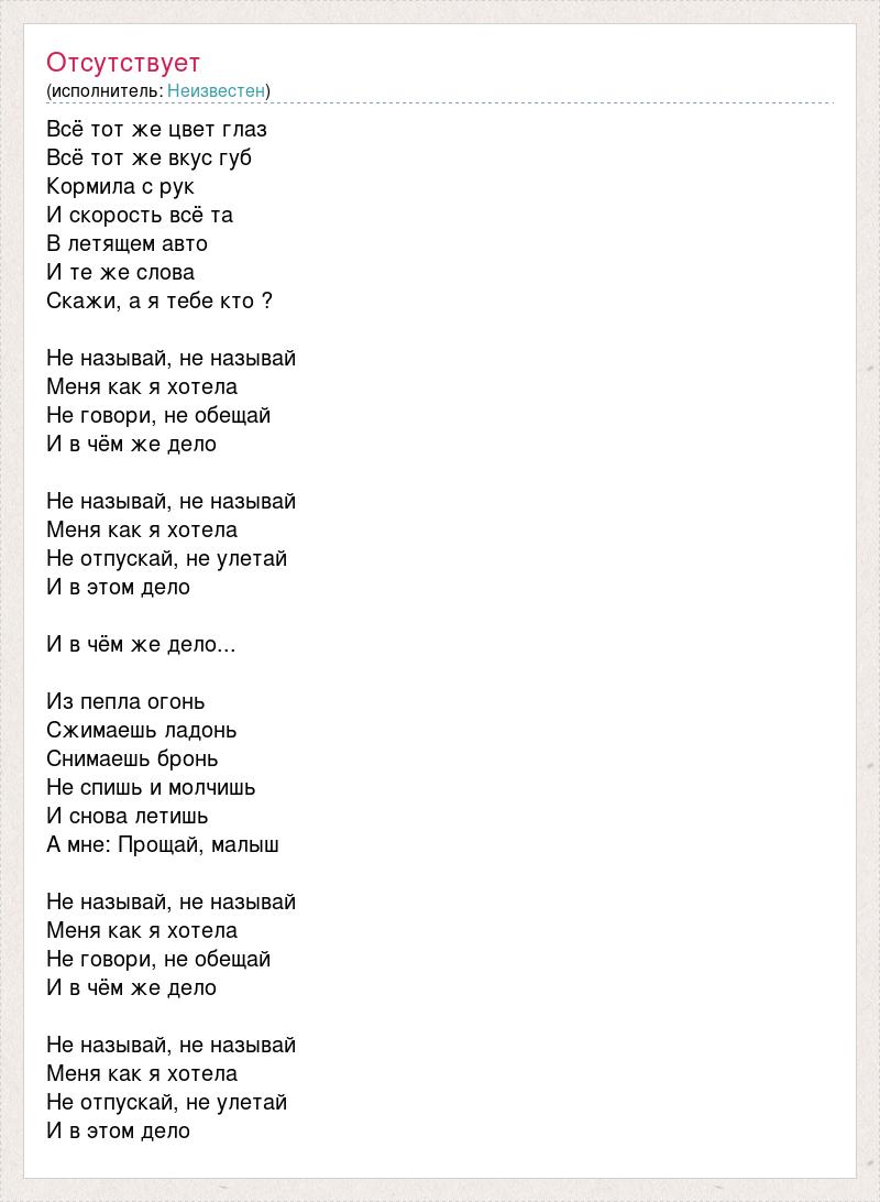 Всё тот же цвет глаз Всё тот же вкус губ Кормила с рук И скорость всё та В летящем авто И те же слова Скажи, а я тебе кто ? Не называй, не называй Меня как я хотела Не говори, не обещай И в чём же дело Не называй, не называй Меня как я хотела Не отпускай, не улетай И в этом дело И в чём же дело... Из пепла огонь Сжимаешь ладонь Снимаешь бронь Не спишь и молчишь И снова летишь А мне: Прощай, малыш Не называй, не называй Меня как я хотела Не говори, не обещай И в чём же дело Не называй, не называй Меня как я хотела Не отпускай, не улетай И в этом дело