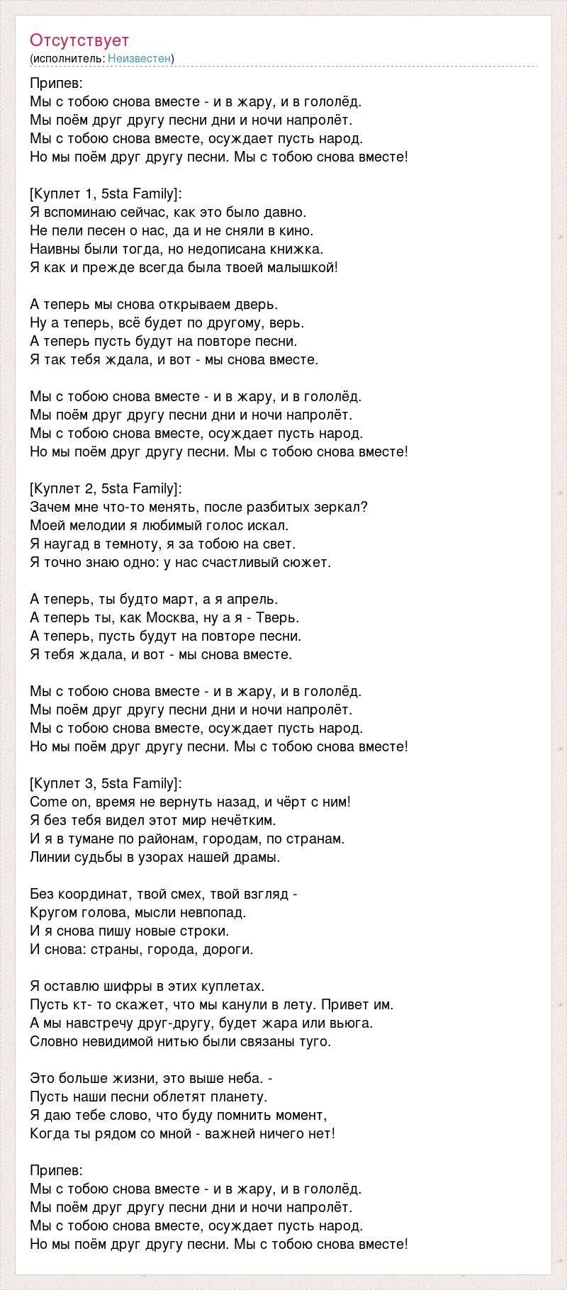 Припев: Мы с тобою снова вместе - и в жару, и в гололёд. Мы поём друг другу песни дни и ночи напролёт. Мы с тобою снова вместе, осуждает пусть народ. Но мы поём друг другу песни. Мы с тобою снова вместе! [Куплет 1, 5sta Family]: Я вспоминаю сейчас, как это было давно. Не пели песен о нас, да и не сняли в кино. Наивны были тогда, но недописана книжка. Я как и прежде всегда была твоей малышкой! А теперь мы снова открываем дверь. Ну а теперь, всё будет по другому, верь. А теперь пусть будут на повторе песни. Я так тебя ждала, и вот - мы снова вместе. Мы с тобою снова вместе - и в жару, и в гололёд. Мы поём друг другу песни дни и ночи напролёт. Мы с тобою снова вместе, осуждает пусть народ. Но мы поём друг другу песни. Мы с тобою снова вместе! [Куплет 2, 5sta Family]: Зачем мне что-то менять, после разбитых зеркал? Моей мелодии я любимый голос искал. Я наугад в темноту, я за тобою на свет. Я точно знаю одно: у нас счастливый сюжет. А теперь, ты будто март, а я апрель. А теперь ты, как Москва, ну а я - Тверь. А теперь, пусть будут на повторе песни. Я тебя ждала, и вот - мы снова вместе. Мы с тобою снова вместе - и в жару, и в гололёд. Мы поём друг другу песни дни и ночи напролёт. Мы с тобою снова вместе, осуждает пусть народ. Но мы поём друг другу песни. Мы с тобою снова вместе! [Куплет 3, 5sta Family]: Come on, время не вернуть назад, и чёрт с ним! Я без тебя видел этот мир нечётким. И я в тумане по районам, городам, по странам. Линии судьбы в узорах нашей драмы. Без координат, твой смех, твой взгляд - Кругом голова, мысли невпопад. И я снова пишу новые строки. И снова: страны, города, дороги. Я оставлю шифры в этих куплетах. Пусть кт- то скажет, что мы канули в лету. Привет им. А мы навстречу друг-другу, будет жара или вьюга. Словно невидимой нитью были связаны туго. Это больше жизни, это выше неба. - Пусть наши песни облетят планету. Я даю тебе слово, что буду помнить момент, Когда ты рядом со мной - важней ничего нет! Припев: Мы с тобою снова вместе - и в жару, и в гололёд. Мы поём друг другу песни дни и ночи напролёт. Мы с тобою снова вместе, осуждает пусть народ. Но мы поём друг другу песни. Мы с тобою снова вместе!