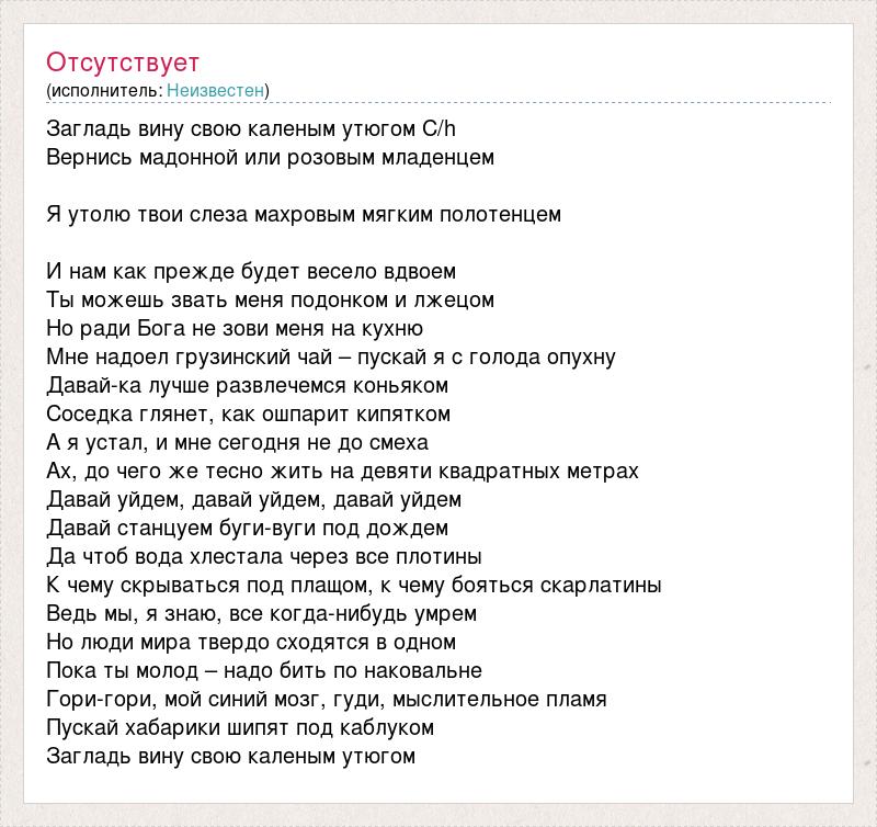 Загладь вину свою каленым утюгом C/h Вернись мадонной или розовым младенцем Я утолю твои слеза махровым мягким полотенцем И нам как прежде будет весело вдвоем Ты можешь звать меня подонком и лжецом Но ради Бога не зови меня на кухню Мне надоел грузинский чай – пускай я с голода опухну Давай-ка лучше развлечемся коньяком Соседка глянет, как ошпарит кипятком А я устал, и мне сегодня не до смеха Ах, до чего же тесно жить на девяти квадратных метрах Давай уйдем, давай уйдем, давай уйдем Давай станцуем буги-вуги под дождем Да чтоб вода хлестала через все плотины К чему скрываться под плащом, к чему бояться скарлатины Ведь мы, я знаю, все когда-нибудь умрем Но люди мира твердо сходятся в одном Пока ты молод – надо бить по наковальне Гори-гори, мой синий мозг, гуди, мыслительное пламя Пускай хабарики шипят под каблуком Загладь вину свою каленым утюгом