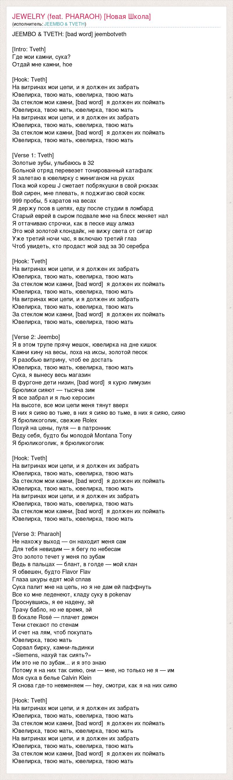 JEEMBO & TVETH: [bad word] jeembotveth [Intro: Tveth] Где мои камни, сука? Отдай мне камни, hoe [Hook: Tveth] На витринах мои цепи, и я должен их забрать Ювелирка, твою мать, ювелирка, твою мать За стеклом мои камни, [bad word] я должен их поймать Ювелирка, твою мать, ювелирка, твою мать На витринах мои цепи, и я должен их забрать Ювелирка, твою мать, ювелирка, твою мать За стеклом мои камни, [bad word] я должен их поймать Ювелирка, твою мать, ювелирка, твою мать [Verse 1: Tveth] Золотые зубы, улыбаюсь в 32 Больной отряд перевезет тонированный катафалк Я залетаю в ювелирку с миниганом на руках Пока мой кореш J сметает побрякушки в свой рюкзак Вой сирен, мне плевать, я поджигаю свой косяк 999 пробы, 5 каратов на весах Я держу псов в цепях, еду после студии в ломбард Старый еврей в сыром подвале мне на блеск меняет нал Я оттачиваю строчки, как в песке ищу алмаз Это мой золотой клондайк, не вижу света от сигар Уже третий ночи час, я включаю третий глаз Чтоб увидеть, кто продаст мой зад за 30 серебра [Hook: Tveth] На витринах мои цепи, и я должен их забрать Ювелирка, твою мать, ювелирка, твою мать За стеклом мои камни, [bad word] я должен их поймать Ювелирка, твою мать, ювелирка, твою мать На витринах мои цепи, и я должен их забрать Ювелирка, твою мать, ювелирка, твою мать За стеклом мои камни, [bad word] я должен их поймать Ювелирка, твою мать, ювелирка, твою мать [Verse 2: Jeembo] Я в этом трупе прячу мешок, ювелирка на дне кишок Камни кину на весы, лоха на иксы, золотой песок Я разобью витрину, чтоб ее достать Ювелирка, твою мать, ювелирка, твою мать Сука, я вынесу весь магазин В фургоне дети низин, [bad word] я курю лимузин Брюлики сияют — тысяча зим Я все забрал и я лью керосин На высоте, все мои цепи меня тянут вверх В них я сияю во тьме, в них я сияю во тьме, в них я сияю, сияю Я брюликоголик, свежие Rolex Похуй на цены, пуля — в патронник Веду себя, будто бы молодой Montana Tony Я брюликоголик, я брюликоголик [Hook: Tveth] На витринах мои цепи, и я должен их забрать Ювелирка, твою мать, ювелирка, твою мать За стеклом мои камни, [bad word] я должен их поймать Ювелирка, твою мать, ювелирка, твою мать На витринах мои цепи, и я должен их забрать Ювелирка, твою мать, ювелирка, твою мать За стеклом мои камни, [bad word] я должен их поймать Ювелирка, твою мать, ювелирка, твою мать [Verse 3: Pharaoh] Не нахожу выход — он находит меня сам Для тебя невидим — я бегу по небесам Это золото течет у меня по зубам Ведь в пальцах — блант, в голде — мой клан Я обвешен, будто Flavor Flav Глаза шкуры едят мой сплав Сука палит мне на цепь, но я не дам ей паффнуть Все ко мне леденеют, кладу суку в pokenav Проснувшись, я ее надену, эй Трачу бабло, но не время, эй В бокале Rosé — плачет демон Тени стекают по стенам И счет на лям, чтоб покупать Ювелирка, твою мать Сорвал бирку, камни-льдинки «Siemens, нахуй так сиять?» Им это не по зубам... и я это знаю Потому я на них так сияю, они — мне, но только не я — им Моя сука в белье Calvin Klein Я снова где-то невменяем — hey, смотри, как я на них сияю [Hook: Tveth] На витринах мои цепи, и я должен их забрать Ювелирка, твою мать, ювелирка, твою мать За стеклом мои камни, [bad word] я должен их поймать Ювелирка, твою мать, ювелирка, твою мать На витринах мои цепи, и я должен их забрать Ювелирка, твою мать, ювелирка, твою мать За стеклом мои камни, [bad word] я должен их поймать Ювелирка, твою мать, ювелирка, твою мать
