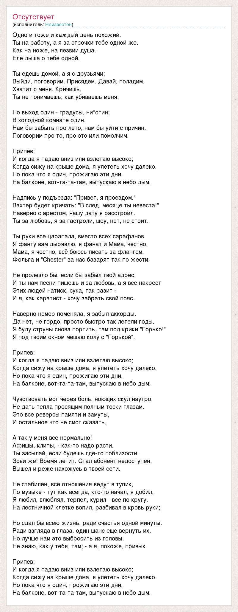 Одно и тоже и каждый день похожий. Ты на работу, а я за строчки тебе одной же. Как на ноже, на лезвии душа. Еле дыша о тебе одной. Ты едешь домой, а я с друзьями; Выйди, поговорим. Присядем. Давай, поладим. Хватит с меня. Кричишь, Ты не понимаешь, как убиваешь меня. Но выход один - градусы, ни*отин; В холодной комнате один. Нам бы забыть про лето, нам бы уйти с причин. Поговорим про то, про это или помолчим. Припев: И когда я падаю вниз или взлетаю высоко; Когда сижу на крыше дома, я улететь хочу далеко. Но пока что я один, прожигаю эти дни. На балконе, вот-та-та-там, выпускаю в небо дым. Надпись у подъезда: "Привет, я проездом." Вахтер будет кричать: "В след. месяце ты невеста!" Наверно с арестом, нашу дату я расстроил. Ты за любовь, я за гастроли, шоу, нет, не стоит. Ты руки все царапала, вместо всех сарафанов Я фанту вам дырявлю, я фанат и Мама, честно. Мама, я честно, всё боюсь писать за флангом. Фольга и "Chester" за нас базарят так по жести. Не пролезло бы, если бы забыл твой адрес. И ты нам песни пишешь и за любовь, а я все накрест Этих людей натиск, сука, так разит - И я, как каратист - хочу забрать свой пояс. Наверно номер поменяла, я забыл аккорды. Да нет, не гордо, просто быстро так летели годы. Я буду струны снова портить, там под крики "Горько!" Я под твоим окном мешаю колу с "Горькой". Припев: И когда я падаю вниз или взлетаю высоко; Когда сижу на крыше дома, я улететь хочу далеко. Но пока что я один, прожигаю эти дни. На балконе, вот-та-та-там, выпускаю в небо дым. Чувствовать мог через боль, ноющих скул наутро. Не дать тепла просящим полным тоски глазам. Это все реверсы памяти и замуты, И остальное что не смог сказать, А так у меня все нормально! Афишы, клипы, - как-то надо расти. Ты засылай, если будешь где-то поблизости. Зови же! Время летит. Стал абонент недоступен. Вышел и реже нахожусь в твоей сети. Не стабилен, все отношения ведут в тупик, По музыке - тут как всегда, кто-то начал, я добил. Я любил, влюблял, терпел, курил - все по кругу. На лестничной клетке вопил, разбивал в кровь руки; Но сдал бы всею жизнь, ради счастья одной минуты. Ради взгляда в глаза, один шанс еще вернуть их. Но лучше нам это выбросить из головы. Не знаю, как у тебя, там; - а я, похоже, привык. Припев: И когда я падаю вниз или взлетаю высоко; Когда сижу на крыше дома, я улететь хочу далеко. Но пока что я один, прожигаю эти дни. На балконе, вот-та-та-там, выпускаю в небо дым.