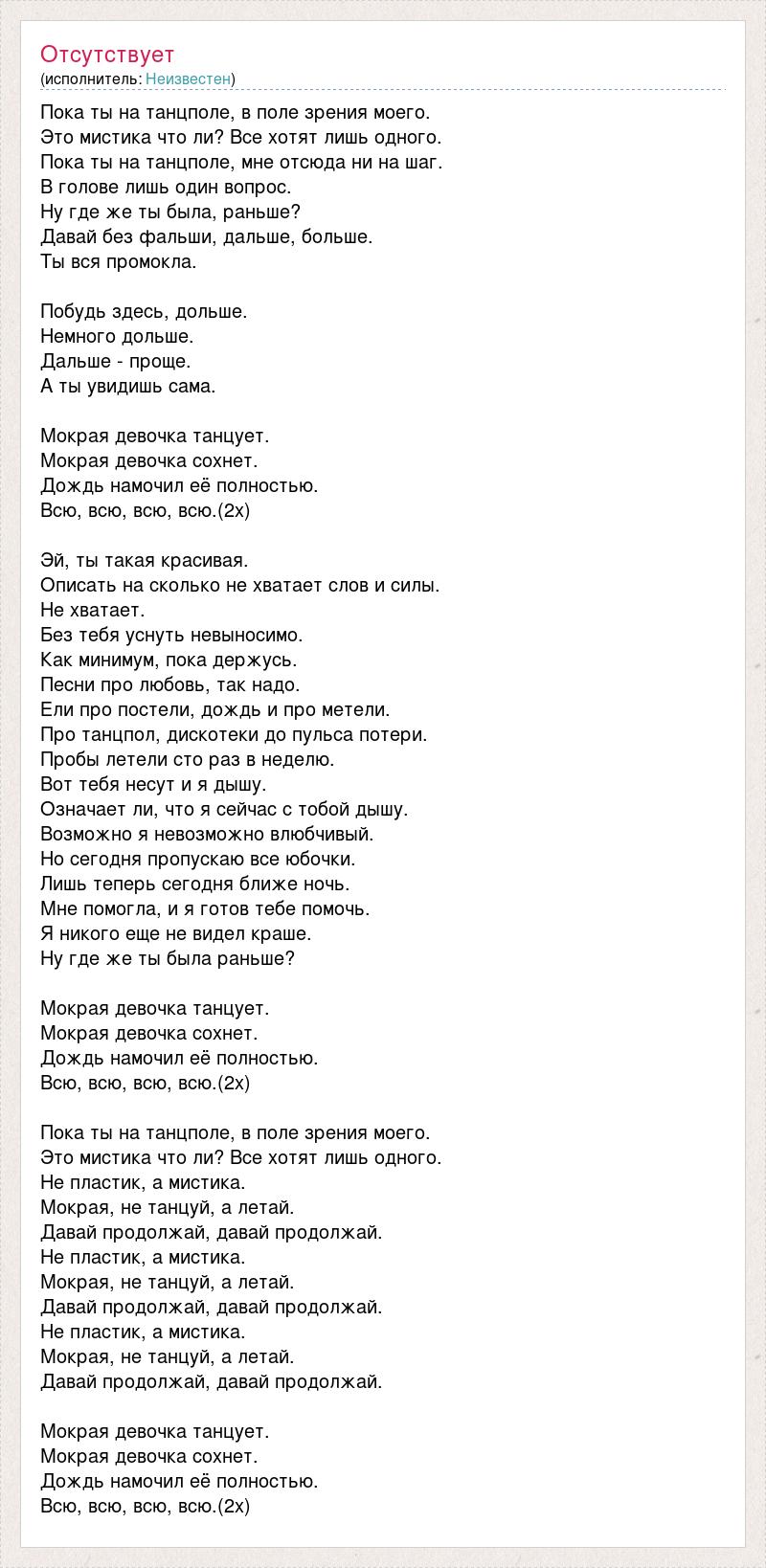 Пока ты на танцполе, в поле зрения моего. Это мистика что ли? Все хотят лишь одного. Пока ты на танцполе, мне отсюда ни на шаг. В голове лишь один вопрос. Ну где же ты была, раньше? Давай без фальши, дальше, больше. Ты вся промокла. Побудь здесь, дольше. Немного дольше. Дальше - проще. А ты увидишь сама. Мокрая девочка танцует. Мокрая девочка сохнет. Дождь намочил её полностью. Всю, всю, всю, всю.(2х) Эй, ты такая красивая. Описать на сколько не хватает слов и силы. Не хватает. Без тебя уснуть невыносимо. Как минимум, пока держусь. Песни про любовь, так надо. Ели про постели, дождь и про метели. Про танцпол, дискотеки до пульса потери. Пробы летели сто раз в неделю. Вот тебя несут и я дышу. Означает ли, что я сейчас с тобой дышу. Возможно я невозможно влюбчивый. Но сегодня пропускаю все юбочки. Лишь теперь сегодня ближе ночь. Мне помогла, и я готов тебе помочь. Я никого еще не видел краше. Ну где же ты была раньше? Мокрая девочка танцует. Мокрая девочка сохнет. Дождь намочил её полностью. Всю, всю, всю, всю.(2х) Пока ты на танцполе, в поле зрения моего. Это мистика что ли? Все хотят лишь одного. Не пластик, а мистика. Мокрая, не танцуй, а летай. Давай продолжай, давай продолжай. Не пластик, а мистика. Мокрая, не танцуй, а летай. Давай продолжай, давай продолжай. Не пластик, а мистика. Мокрая, не танцуй, а летай. Давай продолжай, давай продолжай. Мокрая девочка танцует. Мокрая девочка сохнет. Дождь намочил её полностью. Всю, всю, всю, всю.(2х)