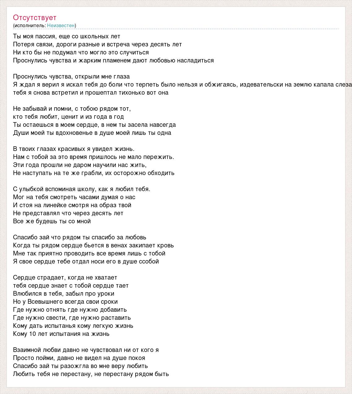 Ты моя пассия, еще со школьных лет Потеря связи, дороги разные и встреча через десять лет Ни кто бы не подумал что могло это случиться Проснулись чувства и жарким пламенем дают любовью насладиться Проснулись чувства, открыли мне глаза Я ждал я верил я искал тебя до боли что терпеть было нельзя и обжигаясь, издевательски на землю капала слеза тебя я снова встретил и прошептал тихонько вот она Не забывай и помни, с тобою рядом тот, кто тебя любит, ценит и из года в год Ты остаешься в моем сердце, в нем ты засела навсегда Души моей ты вдохновенье в душе моей лишь ты одна В твоих глазах красивых я увидел жизнь. Нам с тобой за это время пришлось не мало пережить. Эти года прошли не даром научили нас жить, Не наступать на те же грабли, их осторожно обходить С улыбкой вспоминая школу, как я любил тебя. Мог на тебя смотреть часами думая о нас И стоя на линейке смотря на образ твой Не представлял что через десять лет Все же будешь ты со мной Спасибо зай что рядом ты спасибо за любовь Когда ты рядом сердце бьется в венах закипает кровь Мне так приятно проводить все время лишь с тобой Я свое сердце тебе отдал носи его в душе ссобой Сердце страдает, когда не хватает тебя сердце знает с тобой сердце тает Влюбился в тебя, забыл про уроки Но у Всевышнего всегда свои сроки Где нужно отнять где нужно добавить Где нужно свести, где нужно раставить Кому дать испытанья кому легкую жизнь Кому 10 лет испытания на жизнь Взаимной любви давно не чувствовал ни от кого я Просто пойми, давно не видел на душе покоя Спасибо зай ты разожгла во мне веру любить Любить тебя не перестану, не перестану рядом быть