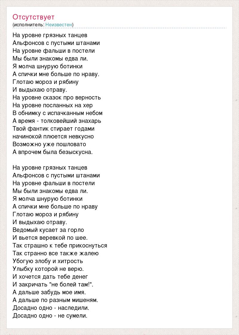На уровне грязных танцев Альфонсов с пустыми штанами На уровне фальши в постели Мы были знакомы едва ли. Я молча шнурую ботинки А спички мне больше по нраву. Глотаю мороз и рябину И выдыхаю отраву. На уровне сказок про верность На уровне посланных на хер В обнимку с испачканным небом А время - толковейший знахарь Твой фантик стирает годами начинокой плюется невкусно Возможно уже пошловато А впрочем была безыскусна. На уровне грязных танцев Альфонсов с пустыми штанами На уровне фальши в постели Мы были знакомы едва ли. Я молча шнурую ботинки А спички мне больше по нраву Глотаю мороз и рябину И выдыхаю отраву. Ведомый кусает за горло И вьется веревкой по шее. Так страшно к тебе прикоснуться Так странно все также жалею Убогую злобу и хитрость Улыбку которой не верю. И хочется дать тебе денег И закричать "не болей там!". А дальше забудь мое имя. А дальше по разным мишеням. Досадно одно - наследили. Досадно одно - не сумели.