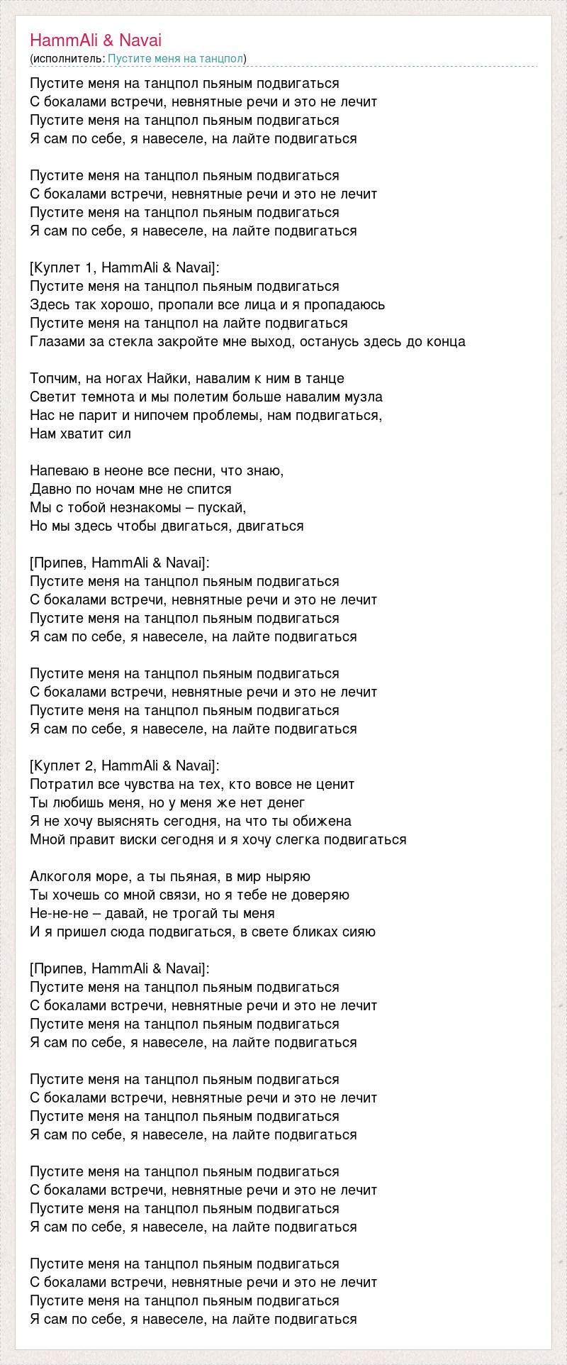Пустите меня на танцпол пьяным подвигаться С бокалами встречи, невнятные речи и это не лечит Пустите меня на танцпол пьяным подвигаться Я сам по себе, я навеселе, на лайте подвигаться Пустите меня на танцпол пьяным подвигаться С бокалами встречи, невнятные речи и это не лечит Пустите меня на танцпол пьяным подвигаться Я сам по себе, я навеселе, на лайте подвигаться [Куплет 1, HammAli & Navai]: Пустите меня на танцпол пьяным подвигаться Здесь так хорошо, пропали все лица и я пропадаюсь Пустите меня на танцпол на лайте подвигаться Глазами за стекла закройте мне выход, останусь здесь до конца Топчим, на ногах Найки, навалим к ним в танце Светит темнота и мы полетим больше навалим музла Нас не парит и нипочем проблемы, нам подвигаться, Нам хватит сил Напеваю в неоне все песни, что знаю, Давно по ночам мне не спится Мы с тобой незнакомы – пускай, Но мы здесь чтобы двигаться, двигаться [Припев, HammAli & Navai]: Пустите меня на танцпол пьяным подвигаться С бокалами встречи, невнятные речи и это не лечит Пустите меня на танцпол пьяным подвигаться Я сам по себе, я навеселе, на лайте подвигаться Пустите меня на танцпол пьяным подвигаться С бокалами встречи, невнятные речи и это не лечит Пустите меня на танцпол пьяным подвигаться Я сам по себе, я навеселе, на лайте подвигаться [Куплет 2, HammAli & Navai]: Потратил все чувства на тех, кто вовсе не ценит Ты любишь меня, но у меня же нет денег Я не хочу выяснять сегодня, на что ты обижена Мной правит виски сегодня и я хочу слегка подвигаться Алкоголя море, а ты пьяная, в мир ныряю Ты хочешь со мной связи, но я тебе не доверяю Не-не-не – давай, не трогай ты меня И я пришел сюда подвигаться, в свете бликах сияю [Припев, HammAli & Navai]: Пустите меня на танцпол пьяным подвигаться С бокалами встречи, невнятные речи и это не лечит Пустите меня на танцпол пьяным подвигаться Я сам по себе, я навеселе, на лайте подвигаться Пустите меня на танцпол пьяным подвигаться С бокалами встречи, невнятные речи и это не лечит Пустите меня на танцпол пьяным подвигаться Я сам по себе, я навеселе, на лайте подвигаться Пустите меня на танцпол пьяным подвигаться С бокалами встречи, невнятные речи и это не лечит Пустите меня на танцпол пьяным подвигаться Я сам по себе, я навеселе, на лайте подвигаться Пустите меня на танцпол пьяным подвигаться С бокалами встречи, невнятные речи и это не лечит Пустите меня на танцпол пьяным подвигаться Я сам по себе, я навеселе, на лайте подвигаться