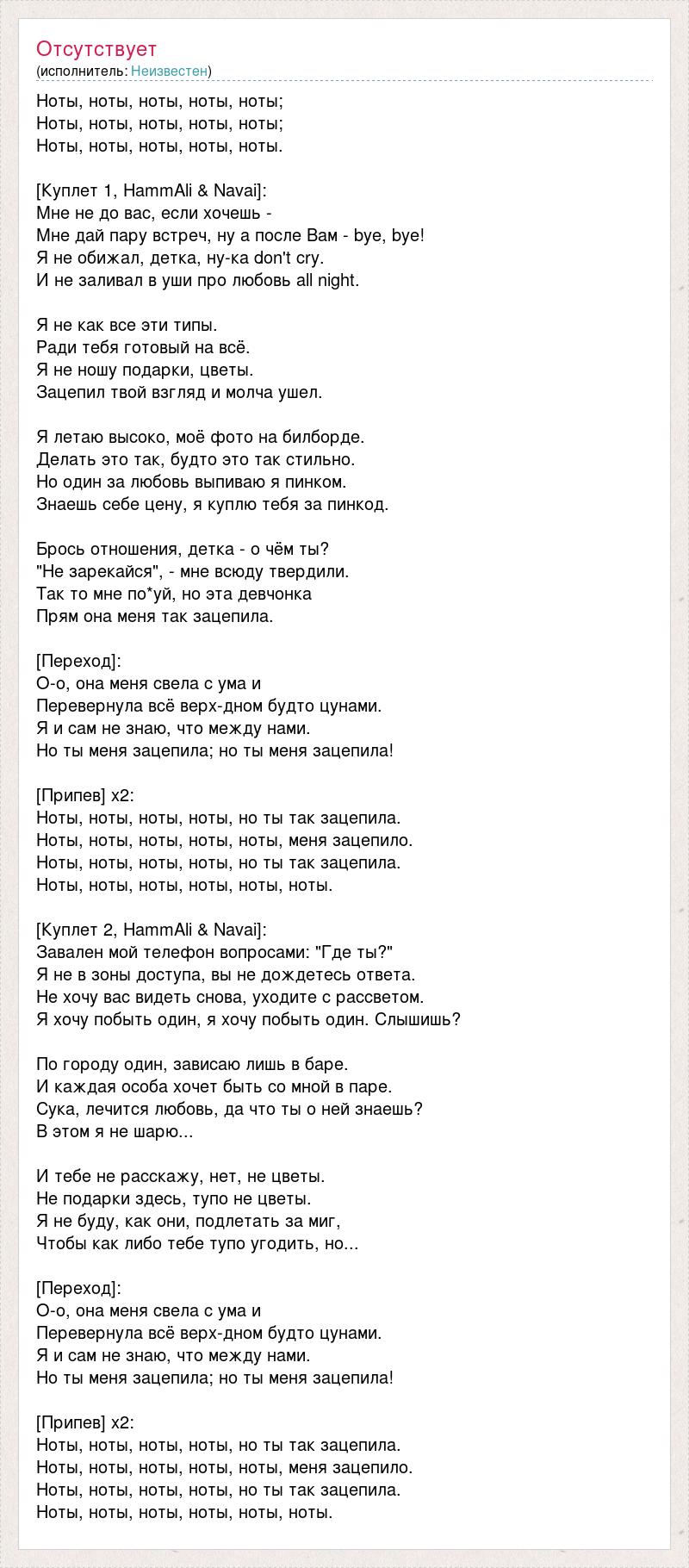 Ноты, ноты, ноты, ноты, ноты; Ноты, ноты, ноты, ноты, ноты; Ноты, ноты, ноты, ноты, ноты. [Куплет 1, HammAli & Navai]: Мне не до вас, если хочешь - Мне дай пару встреч, ну а после Вам - bye, bye! Я не обижал, детка, ну-ка don't cry. И не заливал в уши про любовь all night. Я не как все эти типы. Ради тебя готовый на всё. Я не ношу подарки, цветы. Зацепил твой взгляд и молча ушел. Я летаю высоко, моё фото на билборде. Делать это так, будто это так стильно. Но один за любовь выпиваю я пинком. Знаешь себе цену, я куплю тебя за пинкод. Брось отношения, детка - о чём ты? "Не зарекайся", - мне всюду твердили. Так то мне по*уй, но эта девчонка Прям она меня так зацепила. [Переход]: О-о, она меня свела с ума и Перевернула всё верх-дном будто цунами. Я и сам не знаю, что между нами. Но ты меня зацепила; но ты меня зацепила! [Припев] x2: Ноты, ноты, ноты, ноты, но ты так зацепила. Ноты, ноты, ноты, ноты, ноты, меня зацепило. Ноты, ноты, ноты, ноты, но ты так зацепила. Ноты, ноты, ноты, ноты, ноты, ноты. [Куплет 2, HammAli & Navai]: Завален мой телефон вопросами: "Где ты?" Я не в зоны доступа, вы не дождетесь ответа. Не хочу вас видеть снова, уходите с рассветом. Я хочу побыть один, я хочу побыть один. Слышишь? По городу один, зависаю лишь в баре. И каждая особа хочет быть со мной в паре. Сука, лечится любовь, да что ты о ней знаешь? В этом я не шарю... И тебе не расскажу, нет, не цветы. Не подарки здесь, тупо не цветы. Я не буду, как они, подлетать за миг, Чтобы как либо тебе тупо угодить, но... [Переход]: О-о, она меня свела с ума и Перевернула всё верх-дном будто цунами. Я и сам не знаю, что между нами. Но ты меня зацепила; но ты меня зацепила! [Припев] x2: Ноты, ноты, ноты, ноты, но ты так зацепила. Ноты, ноты, ноты, ноты, ноты, меня зацепило. Ноты, ноты, ноты, ноты, но ты так зацепила. Ноты, ноты, ноты, ноты, ноты, ноты.