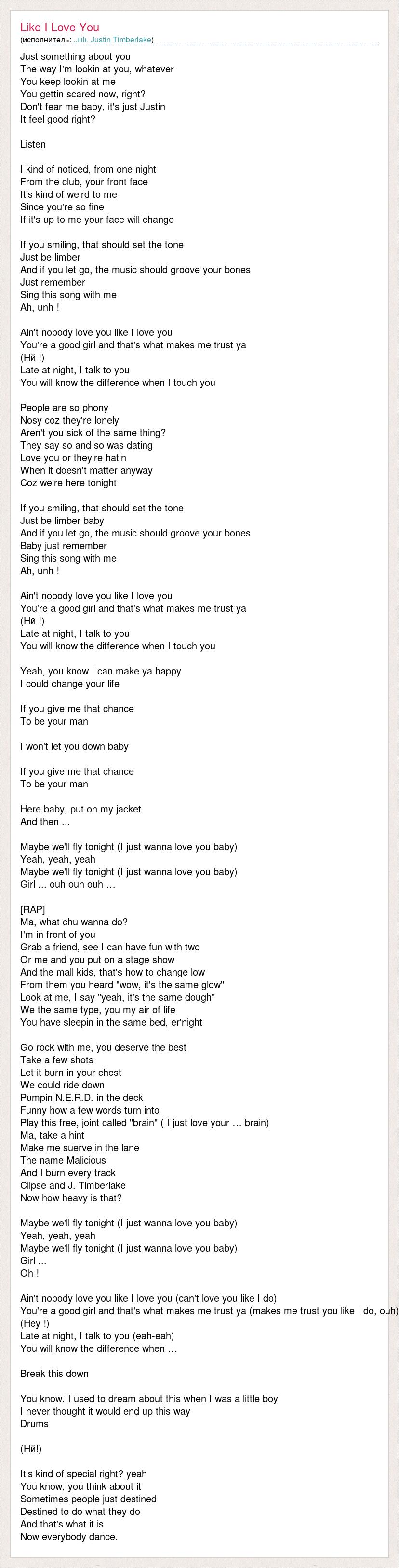 Just something about you The way I'm lookin at you, whatever You keep lookin at me You gettin scared now, right? Don't fear me baby, it's just Justin It feel good right? Listen I kind of noticed, from one night From the club, your front face It's kind of weird to me Since you're so fine If it's up to me your face will change If you smiling, that should set the tone Just be limber And if you let go, the music should groove your bones Just remember Sing this song with me Ah, unh ! Ain't nobody love you like I love you You're a good girl and that's what makes me trust ya (Hй !) Late at night, I talk to you You will know the difference when I touch you People are so phony Nosy coz they're lonely Aren't you sick of the same thing? They say so and so was dating Love you or they're hatin When it doesn't matter anyway Coz we're here tonight If you smiling, that should set the tone Just be limber baby And if you let go, the music should groove your bones Baby just remember Sing this song with me Ah, unh ! Ain't nobody love you like I love you You're a good girl and that's what makes me trust ya (Hй !) Late at night, I talk to you You will know the difference when I touch you Yeah, you know I can make ya happy I could change your life If you give me that chance To be your man I won't let you down baby If you give me that chance To be your man Here baby, put on my jacket And then ... Maybe we'll fly tonight (I just wanna love you baby) Yeah, yeah, yeah Maybe we'll fly tonight (I just wanna love you baby) Girl ... ouh ouh ouh … [RAP] Ma, what chu wanna do? I'm in front of you Grab a friend, see I can have fun with two Or me and you put on a stage show And the mall kids, that's how to change low From them you heard "wow, it's the same glow" Look at me, I say "yeah, it's the same dough" We the same type, you my air of life You have sleepin in the same bed, er'night Go rock with me, you deserve the best Take a few shots Let it burn in your chest We could ride down Pumpin N.E.R.D. in the deck Funny how a few words turn into Play this free, joint called "brain" ( I just love your … brain) Ma, take a hint Make me suerve in the lane The name Malicious And I burn every track Clipse and J. Timberlake Now how heavy is that? Maybe we'll fly tonight (I just wanna love you baby) Yeah, yeah, yeah Maybe we'll fly tonight (I just wanna love you baby) Girl ... Oh ! Ain't nobody love you like I love you (can't love you like I do) You're a good girl and that's what makes me trust ya (makes me trust you like I do, ouh) (Hey !) Late at night, I talk to you (eah-eah) You will know the difference when … Break this down You know, I used to dream about this when I was a little boy I never thought it would end up this way Drums (Hй!) It's kind of special right? yeah You know, you think about it Sometimes people just destined Destined to do what they do And that's what it is Now everybody dance.