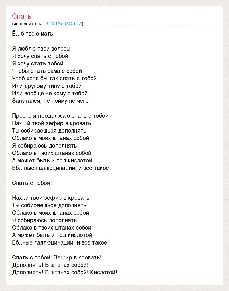 Ё...б твою мать Я люблю твои волосы Я хочу спать с тобой Я хочу стать тобой Чтобы спать сама с собой Чтоб хотя бы так спать с тобой Или другому типу с тобой Или вообще не кому с тобой Запутался, не пойму не чего Просто я продолжаю спать с тобой Нах...й твой зефир в кровать Ты собираешься дополнять Облако в моих штанах собой Я собираюсь дополнять Облако в твоих штанах собой А может быть и под кислотой Еб...ные галлюцинации, и все такое! Спать с тобой! Нах..й твой зефир в кровать Ты собираешься дополнять Облако в моих штанах собой Я собираюсь дополнять Облако в твоих штанах собой А может быть и под кислотой Еб..ные галлюцинации, и все такое! Спать с тобой! Зефир в кровать! Дополнять! В штанах собой! Дополнять! В штанах собой! Кислотой!