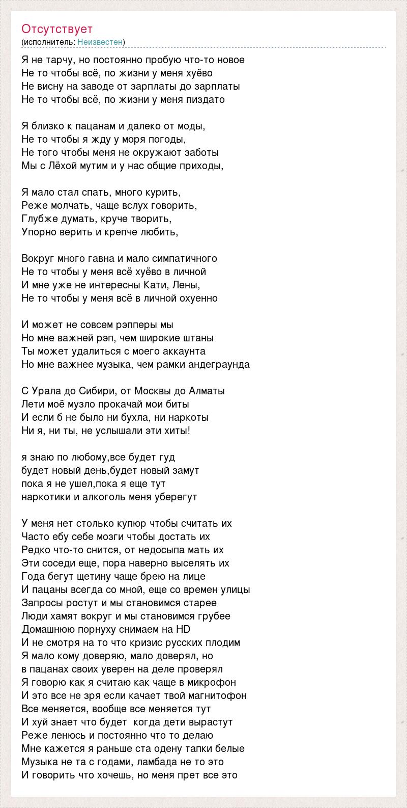 Я не тарчу, но постоянно пробую что-то новое Не то чтобы всё, по жизни у меня хуёво Не висну на заводе от зарплаты до зарплаты Не то чтобы всё, по жизни у меня пиздато Я близко к пацанам и далеко от моды, Не то чтобы я жду у моря погоды, Не того чтобы меня не окружают заботы Мы с Лёхой мутим и у нас общие приходы, Я мало стал спать, много курить, Реже молчать, чаще вслух говорить, Глубже думать, круче творить, Упорно верить и крепче любить, Вокруг много гавна и мало симпатичного Не то чтобы у меня всё хуёво в личной И мне уже не интересны Кати, Лены, Не то чтобы у меня всё в личной охуенно И может не совсем рэпперы мы Но мне важней рэп, чем широкие штаны Ты может удалиться с моего аккаунта Но мне важнее музыка, чем рамки андеграунда С Урала до Сибири, от Москвы до Алматы Лети моё музло прокачай мои биты И если б не было ни бухла, ни наркоты Ни я, ни ты, не услышали эти хиты! я знаю по любому,все будет гуд будет новый день,будет новый замут пока я не ушел,пока я еще тут наркотики и алкоголь меня уберегут У меня нет столько купюр чтобы считать их Часто ебу себе мозги чтобы достать их Редко что-то снится, от недосыпа мать их Эти соседи еще, пора наверно выселять их Года бегут щетину чаще брею на лице И пацаны всегда со мной, еще со времен улицы Запросы ростут и мы становимся старее Люди хамят вокруг и мы становимся грубее Домашнюю порнуху снимаем на HD И не смотря на то что кризис русских плодим Я мало кому доверяю, мало доверял, но в пацанах своих уверен на деле проверял Я говорю как я считаю как чаще в микрофон И это все не зря если качает твой магнитофон Все меняется, вообще все меняется тут И хуй знает что будет когда дети вырастут Реже ленюсь и постоянно что то делаю Мне кажется я раньше ста одену тапки белые Музыка не та с годами, ламбада не то это И говорить что хочешь, но меня прет все это