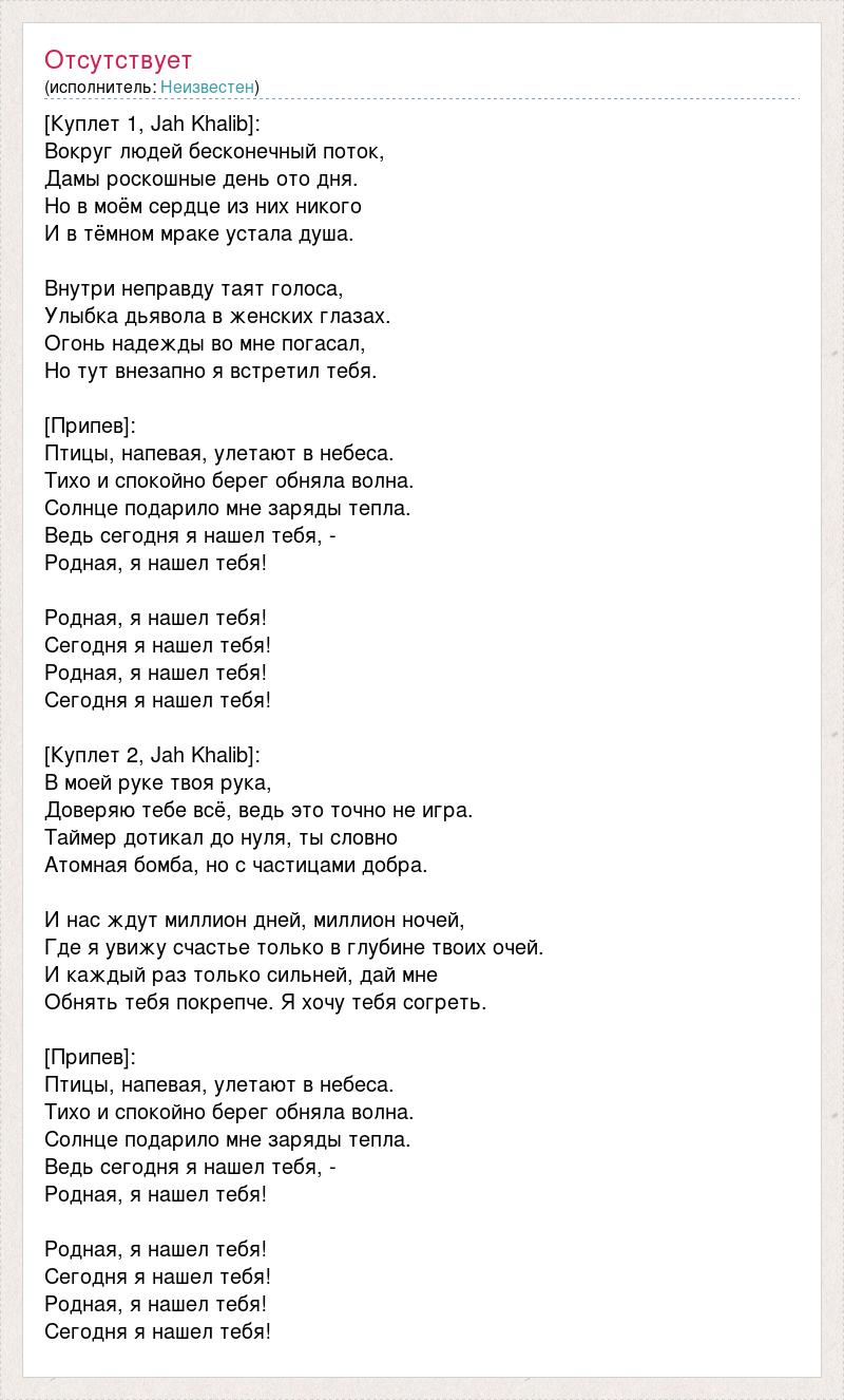[Куплет 1, Jah Khalib]: Вокруг людей бесконечный поток, Дамы роскошные день ото дня. Но в моём сердце из них никого И в тёмном мраке устала душа. Внутри неправду таят голоса, Улыбка дьявола в женских глазах. Огонь надежды во мне погасал, Но тут внезапно я встретил тебя. [Припев]: Птицы, напевая, улетают в небеса. Тихо и спокойно берег обняла волна. Солнце подарило мне заряды тепла. Ведь сегодня я нашел тебя, - Родная, я нашел тебя! Родная, я нашел тебя! Сегодня я нашел тебя! Родная, я нашел тебя! Сегодня я нашел тебя! [Куплет 2, Jah Khalib]: В моей руке твоя рука, Доверяю тебе всё, ведь это точно не игра. Таймер дотикал до нуля, ты словно Атомная бомба, но с частицами добра. И нас ждут миллион дней, миллион ночей, Где я увижу счастье только в глубине твоих очей. И каждый раз только сильней, дай мне Обнять тебя покрепче. Я хочу тебя согреть. [Припев]: Птицы, напевая, улетают в небеса. Тихо и спокойно берег обняла волна. Солнце подарило мне заряды тепла. Ведь сегодня я нашел тебя, - Родная, я нашел тебя! Родная, я нашел тебя! Сегодня я нашел тебя! Родная, я нашел тебя! Сегодня я нашел тебя!
