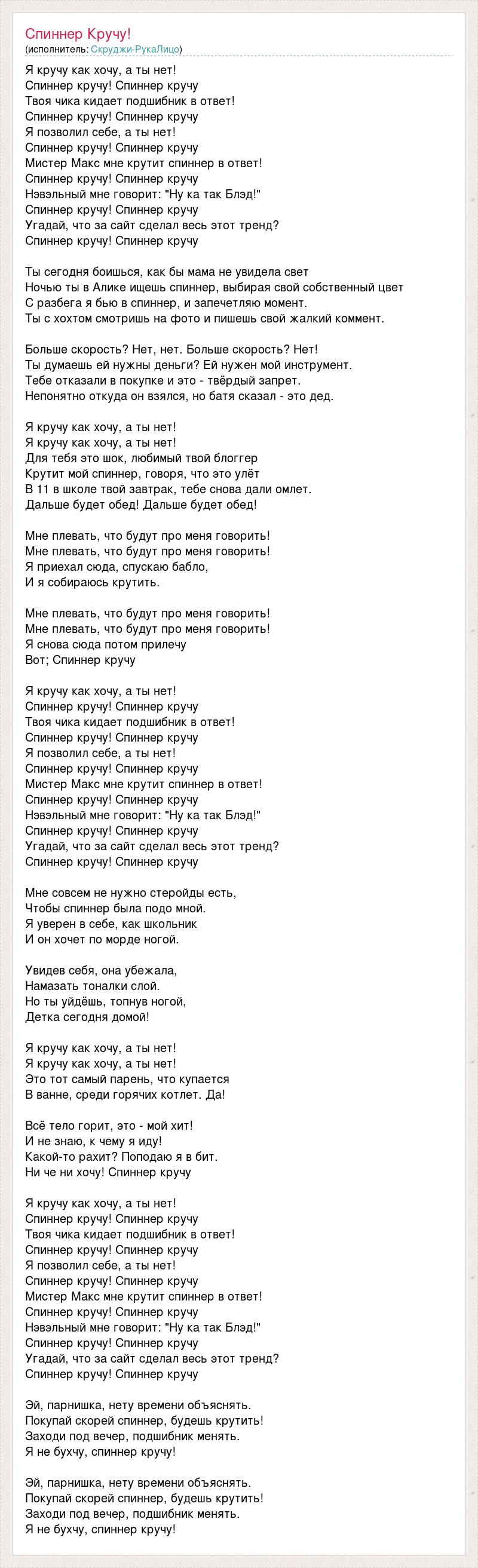 Я кручу как хочу, а ты нет! Спиннер кручу! Спиннер кручу Твоя чика кидает подшибник в ответ! Спиннер кручу! Спиннер кручу Я позволил себе, а ты нет! Спиннер кручу! Спиннер кручу Мистер Макс мне крутит спиннер в ответ! Спиннер кручу! Спиннер кручу Нэвэльный мне говорит: "Ну ка так Блэд!" Спиннер кручу! Спиннер кручу Угадай, что за сайт сделал весь этот тренд? Спиннер кручу! Спиннер кручу Ты сегодня боишься, как бы мама не увидела свет Ночью ты в Алике ищешь спиннер, выбирая свой собственный цвет С разбега я бью в спиннер, и запечетляю момент. Ты с хохтом смотришь на фото и пишешь свой жалкий коммент. Больше скорость? Нет, нет. Больше скорость? Нет! Ты думаешь ей нужны деньги? Ей нужен мой инструмент. Тебе отказали в покупке и это - твёрдый запрет. Непонятно откуда он взялся, но батя сказал - это дед. Я кручу как хочу, а ты нет! Я кручу как хочу, а ты нет! Для тебя это шок, любимый твой блоггер Крутит мой спиннер, говоря, что это улёт В 11 в школе твой завтрак, тебе снова дали омлет. Дальше будет обед! Дальше будет обед! Мне плевать, что будут про меня говорить! Мне плевать, что будут про меня говорить! Я приехал сюда, спускаю бабло, И я собираюсь крутить. Мне плевать, что будут про меня говорить! Мне плевать, что будут про меня говорить! Я снова сюда потом прилечу Вот; Спиннер кручу Я кручу как хочу, а ты нет! Спиннер кручу! Спиннер кручу Твоя чика кидает подшибник в ответ! Спиннер кручу! Спиннер кручу Я позволил себе, а ты нет! Спиннер кручу! Спиннер кручу Мистер Макс мне крутит спиннер в ответ! Спиннер кручу! Спиннер кручу Нэвэльный мне говорит: "Ну ка так Блэд!" Спиннер кручу! Спиннер кручу Угадай, что за сайт сделал весь этот тренд? Спиннер кручу! Спиннер кручу Мне совсем не нужно стеройды есть, Чтобы спиннер была подо мной. Я уверен в себе, как школьник И он хочет по морде ногой. Увидев себя, она убежала, Намазать тоналки слой. Но ты уйдёшь, топнув ногой, Детка сегодня домой! Я кручу как хочу, а ты нет! Я кручу как хочу, а ты нет! Это тот самый парень, что купается В ванне, среди горячих котлет. Да! Всё тело горит, это - мой хит! И не знаю, к чему я иду! Какой-то рахит? Поподаю я в бит. Ни че ни хочу! Спиннер кручу Я кручу как хочу, а ты нет! Спиннер кручу! Спиннер кручу Твоя чика кидает подшибник в ответ! Спиннер кручу! Спиннер кручу Я позволил себе, а ты нет! Спиннер кручу! Спиннер кручу Мистер Макс мне крутит спиннер в ответ! Спиннер кручу! Спиннер кручу Нэвэльный мне говорит: "Ну ка так Блэд!" Спиннер кручу! Спиннер кручу Угадай, что за сайт сделал весь этот тренд? Спиннер кручу! Спиннер кручу Эй, парнишка, нету времени объяснять. Покупай скорей спиннер, будешь крутить! Заходи под вечер, подшибник менять. Я не бухчу, спиннер кручу! Эй, парнишка, нету времени объяснять. Покупай скорей спиннер, будешь крутить! Заходи под вечер, подшибник менять. Я не бухчу, спиннер кручу!