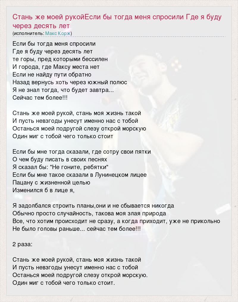 Если бы тогда меня спросили Где я буду через десять лет те горы, пред которыми бессилен И города, где Максу места нет Если не найду пути обратно Назад вернусь хоть через южный полюс Я не знал тогда, что будет завтра... Сейчас тем более!!! Стань же моей рукой, стань моя жизнь такой И пусть невзгоды унесут именно нас с тобой Останься моей подругой слезу открой морскую Один миг с тобой чего только стоит Если бы мне тогда сказали, где сотру свои пятки О чем буду писать в своих песнях Я сказал бы: "Не гоните, ребятки" Если бы мне такое сказали в Лунинецком лицее Пацану с жизненной целью Изменился б в лице я, Я задолбался строить планы,они и не сбывается никогда Обычно просто случайность, такова моя злая природа Все, что хотим происходит не сразу, а когда приходит, уже не прикольно Не было головы раньше... сейчас тем более!!! 2 раза: Стань же моей рукой, стань моя жизнь такой И пусть невзгоды унесут именно нас с тобой Останься моей подругой слезу открой морскую. Один миг с тобой чего только стоит.