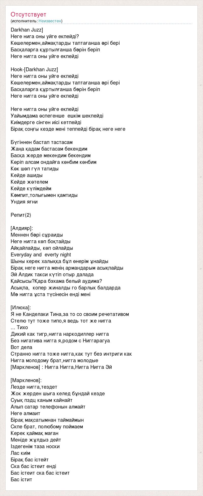 Darkhan Juzz] Неге нига оны уйге екпейді? Көшелермен,аймақтарды таптағанша əрі бері Басқаларға құртылғанша бəрін беріп Неге нигга оны уйге екпейді Hook-[Darkhan Juzz] Неге нигга оны уйге екпейді Көшелермен,аймақтарды таптағанша əрі бері Басқаларға құртылғанша бəрін беріп Неге нигга оны уйге екпейді Неге нигга оны уйге екпейді Уайымдама өспегенше ешкім шекпейді Киімдерге сінген иісі кетпейді Бірақ соңғы кезде мені теппейді бірақ неге неге Бүгіннен бастап тастасам Жаңа қадам бастасам бекендим Басқа жерде мекендим бекендим Көріп алсам ондайға көнбим көнбим Көк шөп гүл татиды Кейде ашиды Кейде жөтелем Кейде күлімдейм Кəмпит,толығымен қамтиды Ундия яғни Репит(2) [Алдияр]: Меннен бəрі сұраиды Неге нигга көп боқтайды Айқайлайды, көп ойлайды Everyday and everty night Шыны керек халыққа бұл өнерім ұнайды Бірақ неге нигга менің армандарым асықпайды Эй Алдик такси күтіп отыр далада Қайсысы?Қара бэхама белый аудима? Асықпа, копер жиналды го барлык балдарда Мə нигга ұста түсінесін енді мені [Илюха]: Я не Канделаки Тина,за то со своим речетативом Стелю тут тоже типо,я ведь тот же нигга ... Тихо Дикий как тигр,нигга наркодиллер нигга Без нигатива нигга я,родом с Ниггарагуа Вот дела Странно нигга тоже нигга,как тут без интриги как Нигга молодому брат,нигга молодые [Маркленов] : Нигга Нигга,Нигга Нигга Эй [Маркленов]: Лезде нигга,тездет Жок жерден шыға келед бұндай кезде Суық пздц каным кайнайт Алып сатар телефонын алмайт Неге алмаит Бірақ мақсатымнан таймаймын Скпе брат, полюбому поймаем Керек қаймақ маған Меніде жұлдыз дейт Іздегенім таза носки Лас киім Бірақ бас істейт Ска бас істеит енді Бас істеит ска бас істеит Бас істит