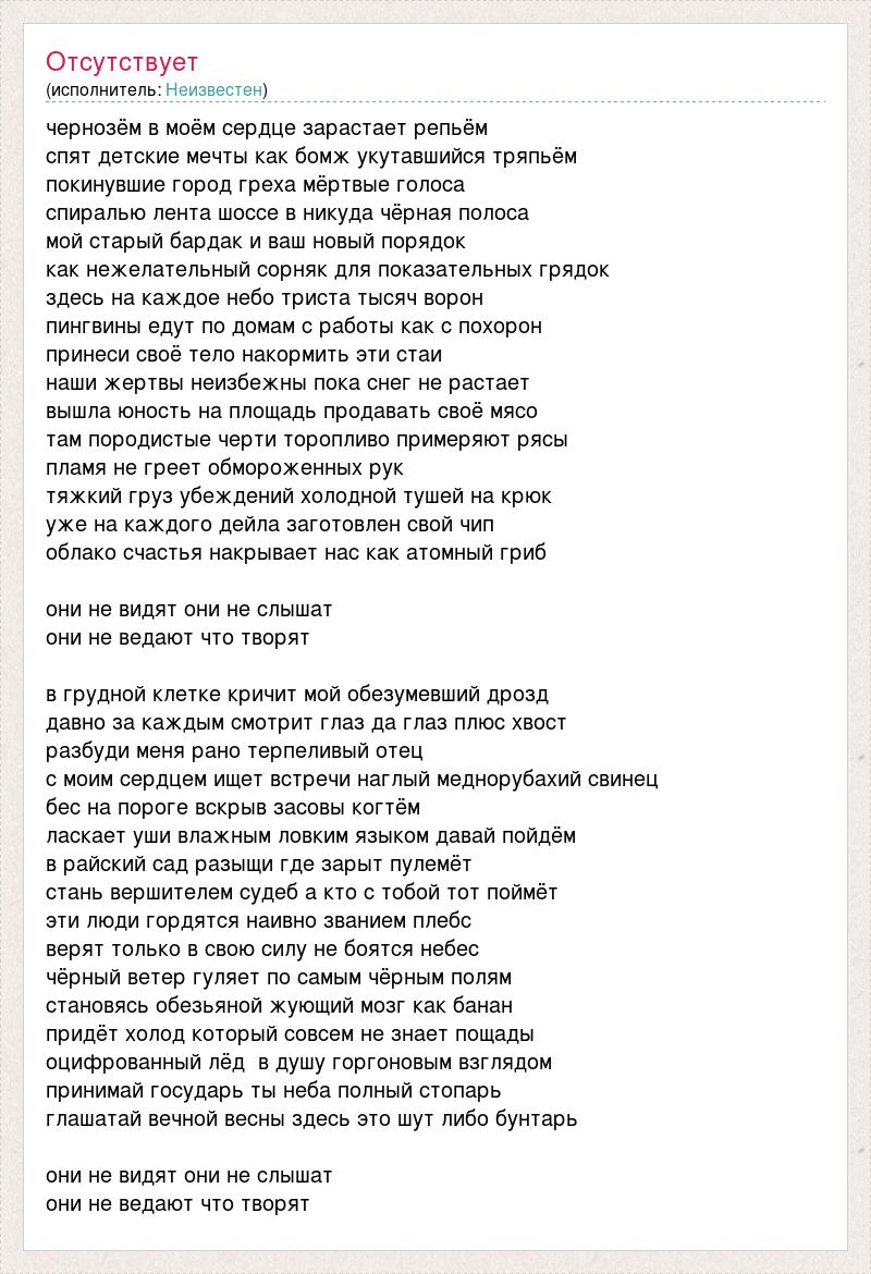 чернозём в моём сердце зарастает репьём спят детские мечты как бомж укутавшийся тряпьём покинувшие город греха мёртвые голоса спиралью лента шоссе в никуда чёрная полоса мой старый бардак и ваш новый порядок как нежелательный сорняк для показательных грядок здесь на каждое небо триста тысяч ворон пингвины едут по домам с работы как с похорон принеси своё тело накормить эти стаи наши жертвы неизбежны пока снег не растает вышла юность на площадь продавать своё мясо там породистые черти торопливо примеряют рясы пламя не греет обмороженных рук тяжкий груз убеждений холодной тушей на крюк уже на каждого дейла заготовлен свой чип облако счастья накрывает нас как атомный гриб они не видят они не слышат они не ведают что творят в грудной клетке кричит мой обезумевший дрозд давно за каждым смотрит глаз да глаз плюс хвост разбуди меня рано терпеливый отец с моим сердцем ищет встречи наглый меднорубахий свинец бес на пороге вскрыв засовы когтём ласкает уши влажным ловким языком давай пойдём в райский сад разыщи где зарыт пулемёт стань вершителем судеб а кто с тобой тот поймёт эти люди гордятся наивно званием плебс верят только в свою силу не боятся небес чёрный ветер гуляет по самым чёрным полям становясь обезьяной жующий мозг как банан придёт холод который совсем не знает пощады оцифрованный лёд в душу горгоновым взглядом принимай государь ты неба полный стопарь глашатай вечной весны здесь это шут либо бунтарь они не видят они не слышат они не ведают что творят