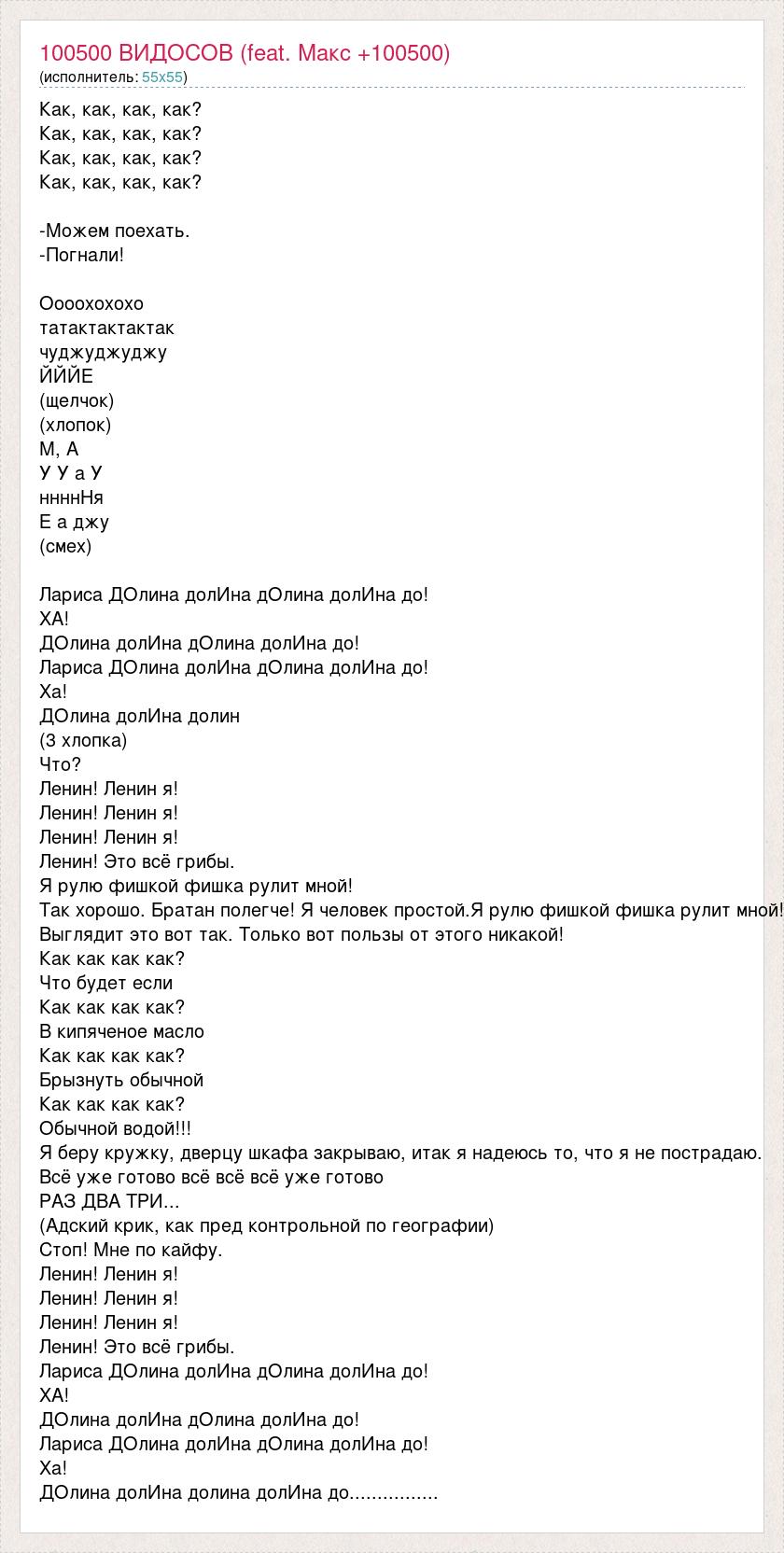 Как, как, как, как? Как, как, как, как? Как, как, как, как? Как, как, как, как? -Можем поехать. -Погнали! Оооохохохо татактактактак чуджуджуджу ЙЙЙЕ (щелчок) (хлопок) М, А У У а У ннннНя Е а джу (смех) Лариса ДОлина долИна дОлина долИна до! ХА! ДОлина долИна дОлина долИна до! Лариса ДОлина долИна дОлина долИна до! Ха! ДОлина долИна долин (3 хлопка) Что? Ленин! Ленин я! Ленин! Ленин я! Ленин! Ленин я! Ленин! Это всё грибы. Я рулю фишкой фишка рулит мной! Так хорошо. Братан полегче! Я человек простой.Я рулю фишкой фишка рулит мной! Выглядит это вот так. Только вот пользы от этого никакой! Как как как как? Что будет если Как как как как? В кипяченое масло Как как как как? Брызнуть обычной Как как как как? Обычной водой!!! Я беру кружку, дверцу шкафа закрываю, итак я надеюсь то, что я не пострадаю. Всё уже готово всё всё всё уже готово РАЗ ДВА ТРИ... (Адский крик, как пред контрольной по географии) Стоп! Мне по кайфу. Ленин! Ленин я! Ленин! Ленин я! Ленин! Ленин я! Ленин! Это всё грибы. Лариса ДОлина долИна дОлина долИна до! ХА! ДОлина долИна дОлина долИна до! Лариса ДОлина долИна дОлина долИна до! Ха! ДОлина долИна долина долИна до................