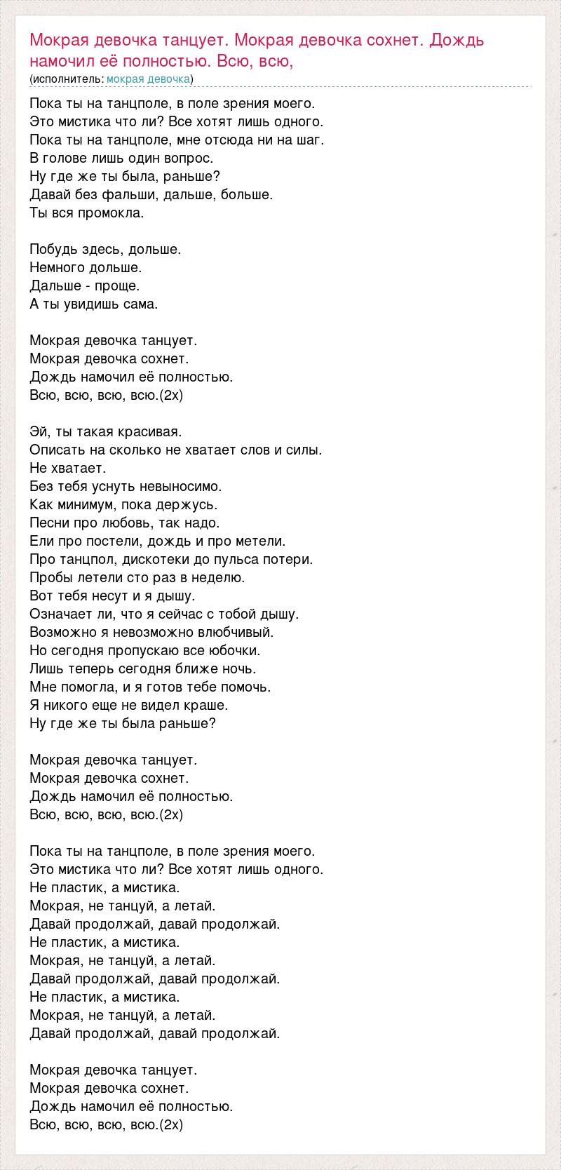 Пока ты на танцполе, в поле зрения моего. Это мистика что ли? Все хотят лишь одного. Пока ты на танцполе, мне отсюда ни на шаг. В голове лишь один вопрос. Ну где же ты была, раньше? Давай без фальши, дальше, больше. Ты вся промокла. Побудь здесь, дольше. Немного дольше. Дальше - проще. А ты увидишь сама. Мокрая девочка танцует. Мокрая девочка сохнет. Дождь намочил её полностью. Всю, всю, всю, всю.(2х) Эй, ты такая красивая. Описать на сколько не хватает слов и силы. Не хватает. Без тебя уснуть невыносимо. Как минимум, пока держусь. Песни про любовь, так надо. Ели про постели, дождь и про метели. Про танцпол, дискотеки до пульса потери. Пробы летели сто раз в неделю. Вот тебя несут и я дышу. Означает ли, что я сейчас с тобой дышу. Возможно я невозможно влюбчивый. Но сегодня пропускаю все юбочки. Лишь теперь сегодня ближе ночь. Мне помогла, и я готов тебе помочь. Я никого еще не видел краше. Ну где же ты была раньше? Мокрая девочка танцует. Мокрая девочка сохнет. Дождь намочил её полностью. Всю, всю, всю, всю.(2х) Пока ты на танцполе, в поле зрения моего. Это мистика что ли? Все хотят лишь одного. Не пластик, а мистика. Мокрая, не танцуй, а летай. Давай продолжай, давай продолжай. Не пластик, а мистика. Мокрая, не танцуй, а летай. Давай продолжай, давай продолжай. Не пластик, а мистика. Мокрая, не танцуй, а летай. Давай продолжай, давай продолжай. Мокрая девочка танцует. Мокрая девочка сохнет. Дождь намочил её полностью. Всю, всю, всю, всю.(2х)