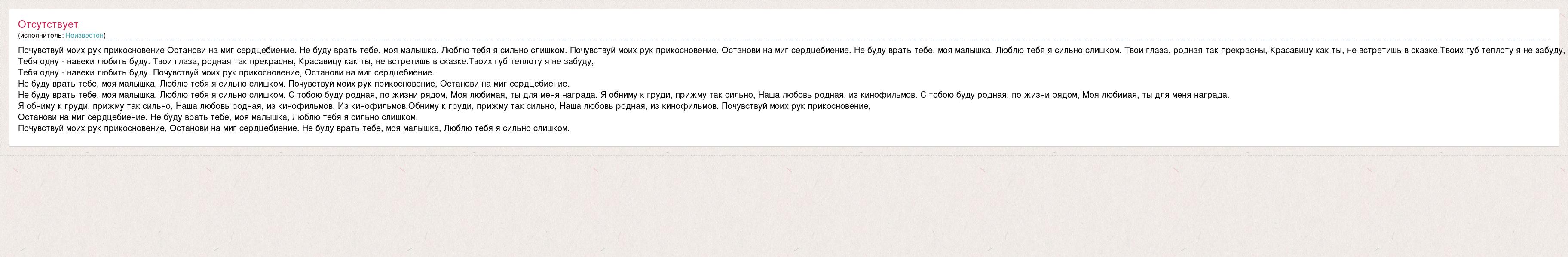 Почувствуй моих рук прикосновение Останови на миг сердцебиение. Не буду врать тебе, моя малышка, Люблю тебя я сильно слишком. Почувствуй моих рук прикосновение, Останови на миг сердцебиение. Не буду врать тебе, моя малышка, Люблю тебя я сильно слишком. Твои глаза, родная так прекрасны, Красавицу как ты, не встретишь в сказке.Твоих губ теплоту я не забуду, Тебя одну - навеки любить буду. Твои глаза, родная так прекрасны, Красавицу как ты, не встретишь в сказке.Твоих губ теплоту я не забуду, Тебя одну - навеки любить буду. Почувствуй моих рук прикосновение, Останови на миг сердцебиение. Не буду врать тебе, моя малышка, Люблю тебя я сильно слишком. Почувствуй моих рук прикосновение, Останови на миг сердцебиение. Не буду врать тебе, моя малышка, Люблю тебя я сильно слишком. С тобою буду родная, по жизни рядом, Моя любимая, ты для меня награда. Я обниму к груди, прижму так сильно, Наша любовь родная, из кинофильмов. С тобою буду родная, по жизни рядом, Моя любимая, ты для меня награда. Я обниму к груди, прижму так сильно, Наша любовь родная, из кинофильмов. Из кинофильмов.Обниму к груди, прижму так сильно, Наша любовь родная, из кинофильмов. Почувствуй моих рук прикосновение, Останови на миг сердцебиение. Не буду врать тебе, моя малышка, Люблю тебя я сильно слишком. Почувствуй моих рук прикосновение, Останови на миг сердцебиение. Не буду врать тебе, моя малышка, Люблю тебя я сильно слишком.