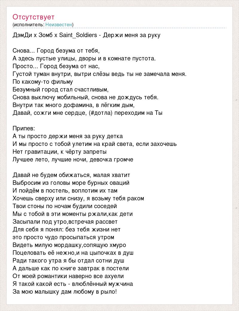 ДэмДи x Зомб x Saint_Soldiers - Держи меня за руку Снова... Город безума от тебя, А здесь пустые улицы, дворы и в комнате пустота. Просто... Город безума от нас, Густой туман внутри, вытри слёзы ведь ты не замечала меня. По какому-то фильму Безумный город стал счастливым, Снова выключу мобильный, снова не дождусь тебя. Внутри так много дофамина, в лёгким дым, Давай, сожги мне сердце, (#дотла) переходим на Ты Припев: А ты просто держи меня за руку детка И мы просто с тобой улетим на край света, если захочешь Нет гравитации, к чёрту запреты Лучшее лето, лучшие ночи, девочка громче Давай не будем обижаться, малая хватит Выбросим из головы море бурных оваций И пойдём в постель, воплотим их там Хочешь сверху или снизу, я возьму тебя раком Твои стоны по ночам будили соседей Мы с тобой в эти моменты ржали,как дети Засыпали под утро,встречая рассвет Для себя я понял: без тебя жизни нет это просто чудо просыпаться утром Видеть милую мордашку,сопящую хмуро Поцеловать её нежно,и на цыпочках в душ Ради такого утра я бы отдал сотни душ А дальше как по книге завтрак в постели От моей романтики наверно все ахуели Я такой какой есть - влюблённый мужчина За мою малышку дам любому в рыло!