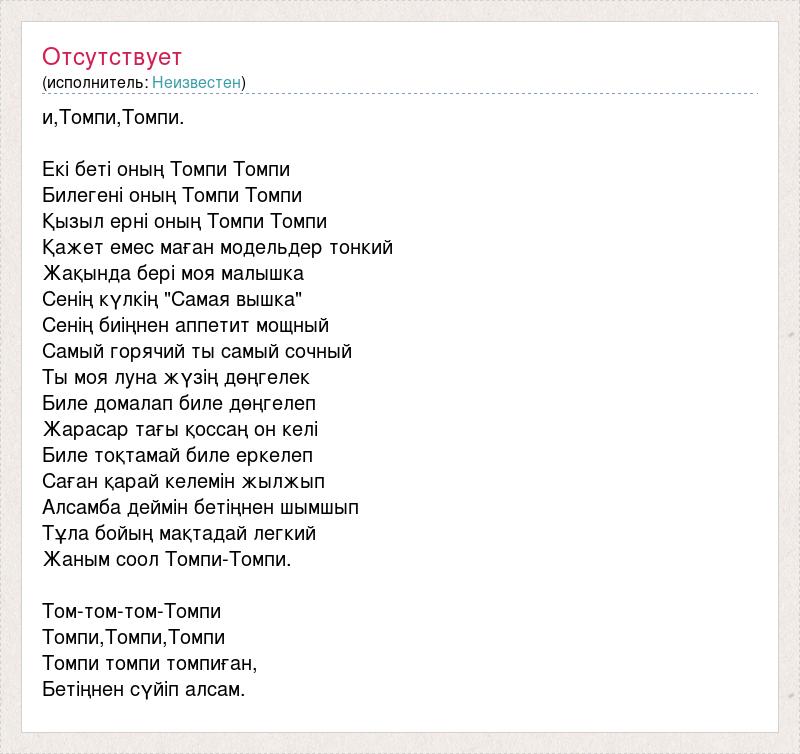 и,Томпи,Томпи. Екі беті оның Томпи Томпи Билегені оның Томпи Томпи Қызыл ерні оның Томпи Томпи Қажет емес маған модельдер тонкий Жақында бері моя малышка Сенің күлкің "Самая вышка" Сенің биіңнен аппетит мощный Самый горячий ты самый сочный Ты моя луна жүзің дөңгелек Биле домалап биле дөңгелеп Жарасар тағы қоссаң он келі Биле тоқтамай биле еркелеп Саған қарай келемін жылжып Алсамба деймін бетіңнен шымшып Тұла бойың мақтадай легкий Жаным соол Томпи-Томпи. Том-том-том-Томпи Томпи,Томпи,Томпи Томпи томпи томпиған, Бетіңнен сүйіп алсам.