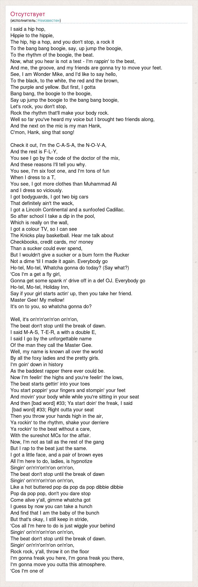 I said a hip hop, Hippie to the hippie, The hip, hip a hop, and you don't stop, a rock it To the bang bang boogie, say, up jump the boogie, To the rhythm of the boogie, the beat. Now, what you hear is not a test - I'm rappin' to the beat, And me, the groove, and my friends are gonna try to move your feet. See, I am Wonder Mike, and I'd like to say hello, To the black, to the white, the red and the brown, The purple and yellow. But first, I gotta Bang bang, the boogie to the boogie, Say up jump the boogie to the bang bang boogie, Let's rock, you don't stop, Rock the rhythm that'll make your body rock. Well so far you've heard my voice but I brought two friends along, And the next on the mic is my man Hank, C'mon, Hank, sing that song! Check it out, I'm the C-A-S-A, the N-O-V-A, And the rest is F-L-Y, You see I go by the code of the doctor of the mix, And these reasons I'll tell you why. You see, I'm six foot one, and I'm tons of fun When I dress to a T, You see, I got more clothes than Muhammad Ali and I dress so viciously. I got bodyguards, I got two big cars That definitely ain't the wack, I got a Lincoln Continental and a sunfoofed Cadillac. So after school I take a dip in the pool, Which is really on the wall, I got a colour TV, so I can see The Knicks play basketball. Hear me talk about Checkbooks, credit cards, mo' money Than a sucker could ever spend, But I wouldn't give a sucker or a bum form the Rucker Not a dime 'til I made it again. Everybody go Ho-tel, Mo-tel, Whatcha gonna do today? (Say what?) 'Cos I'm a get a fly girl, Gonna get some spank n' drive off in a def OJ. Everybody go Ho-tel, Mo-tel, Holiday Inn, Say if your girl starts actin' up, then you take her friend. Master Gee! My mellow! It's on to you, so whatcha gonna do? Well, it's on'n'n'on'n'on on'n'on, The beat don't stop until the break of dawn. I said M-A-S, T-E-R, a with a double E, I said I go by the unforgettable name Of the man they call the Master Gee. Well, my name is known all over the world By all the foxy ladies and the pretty girls. I'm goin' down in history As the baddest rapper there ever could be. Now I'm feelin' the highs and you're feelin' the lows, The beat starts gettin' into your toes You start poppin' your fingers and stompin' your feet And movin' your body while while you're sitting in your seat And then [bad word] #33; Ya start doin' the freak, I said [bad word] #33; Right outta your seat Then you throw your hands high in the air, Ya rockin' to the rhythm, shake your derriere Ya rockin' to the beat without a care, With the sureshot MCs for the affair. Now, I'm not as tall as the rest of the gang But I rap to the beat just the same. I got a little face, and a pair of brown eyes All I'm here to do, ladies, is hypnotize Singin' on'n'n'on'n'on on'n'on, The beat don't stop until the break of dawn Singin' on'n'n'on'n'on on'n'on, Like a hot buttered pop da pop da pop dibbie dibbie Pop da pop pop, don't you dare stop Come alive y'all, gimme whatcha got I guess by now you can take a hunch And find that I am the baby of the bunch But that's okay, I still keep in stride, 'Cos all I'm here to do is just wiggle your behind Singin' on'n'n'on'n'on on'n'on, The beat don't stop until the break of dawn. Singin' on'n'n'on'n'on on'n'on, Rock rock, y'all, throw it on the floor I'm gonna freak you here, I'm gona freak you there, I'm gonna move you outta this atmosphere. 'Cos I'm one of